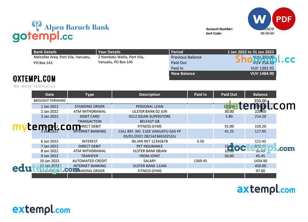 sample Vanuatu Alpen Baruch Bank statement template in Word and PDF format download
