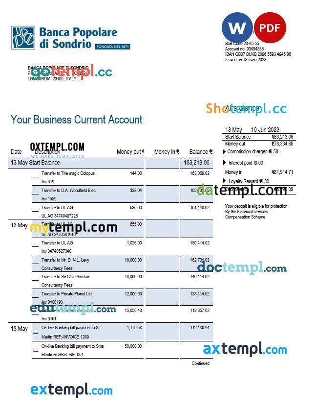 Banca Populaire di Sondrio Business Bank statement Word and PDF template go