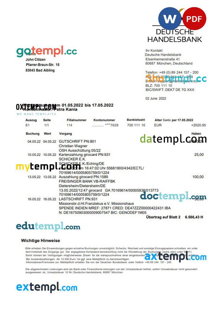 Like all our documents, Germany Handelsbank bank statement sample is of high quality. The templates help you to prove your address where an address verification is required.