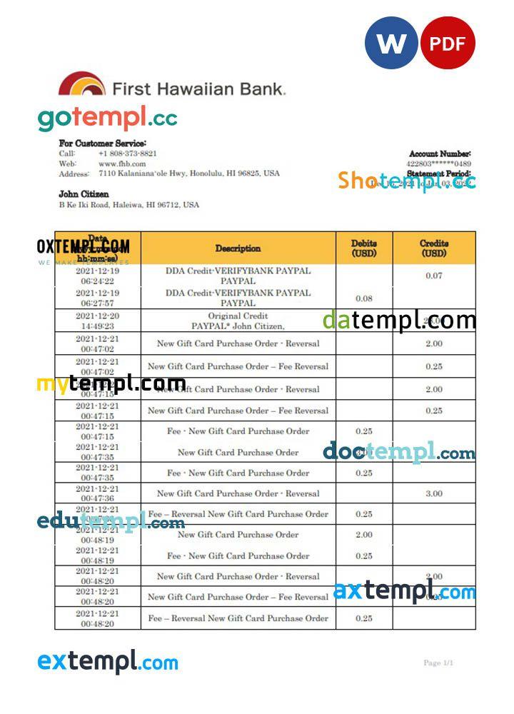 Completely editable Hawaii First Hawaiian Bank statement template in .doc format.