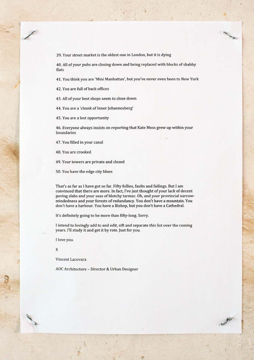 In Croydon town centre, errors of judgement are constructed on the ruins of failed visions, major roads dissect the town centre, mini-manhattan skyscrapers render pavements into unwalkable wind tunnels. Croydonisation comprises of a photograph printed on a bus shelter poster, hung next to a public notice, a love letter to Croydon written by Croydon-born architect Vincent Lacovara. Lacovara’s love letter explores his conflicting feelings of tenderness and disappointment with a place that since its regeneration began in the 1890s continues to be used as an example of failed British town planning.