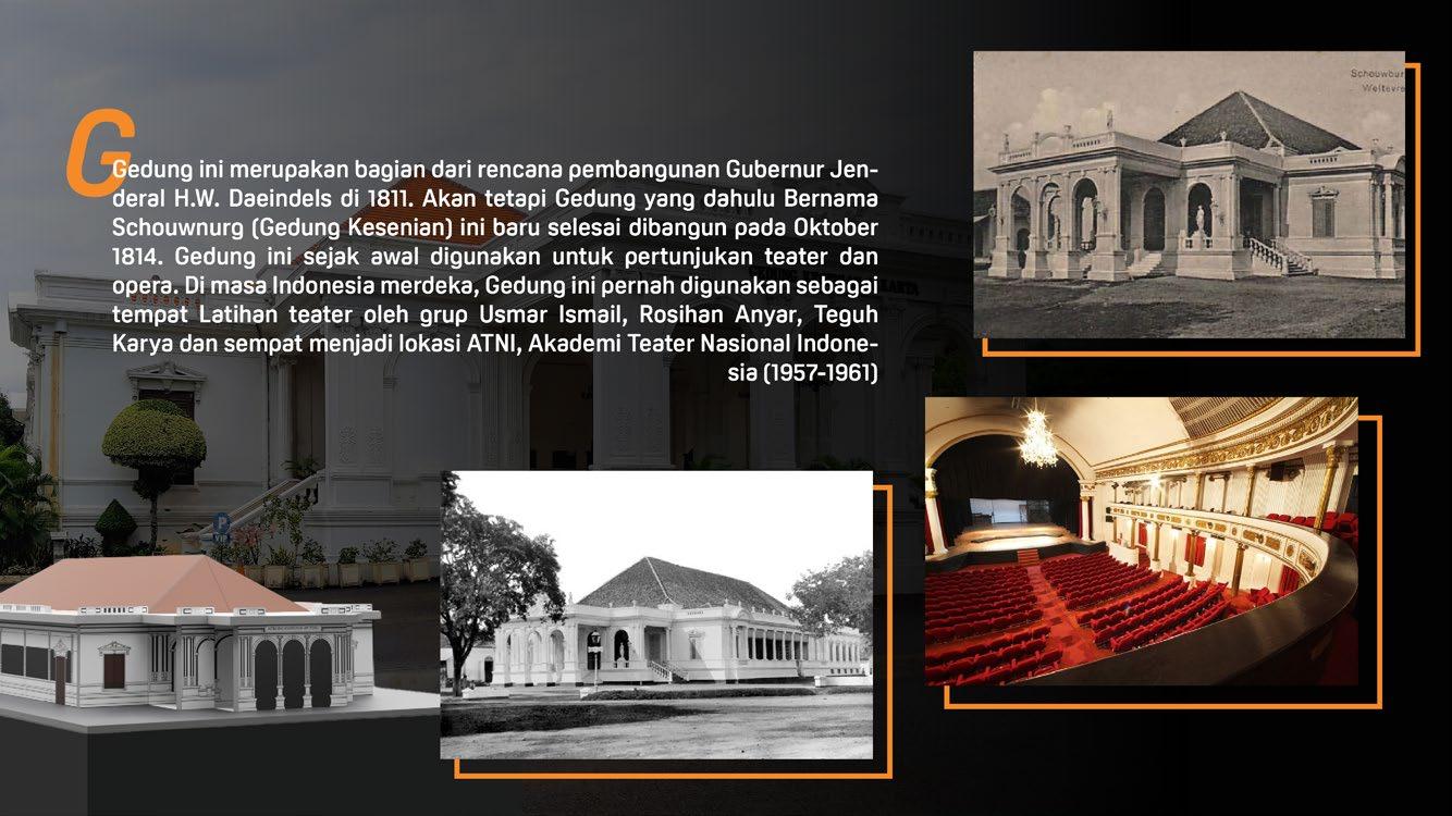 Gedung ini merupakan bagian dari rencana pembangunan Gubernur Jenderal H.W. Daeindels di 1811 Akan tetapi Gedung yang dahulu Bernama Schouwnurg (Gedung Kesenian) ini baru selesai dibangun pada Oktober 1814. Gedung ini sejak awal digunakan untuk pertunjukan teater dan opera. Di masa Indonesia merdeka, Gedung ini pernah digunakan sebagai tempat Latihan teater oleh grup Usmar Ismail, Rosihan Anyar, Teguh Karya dan sempat menjadi lokasi ATNI, Akademi Teater Nasional Indonesia (1957-1961)