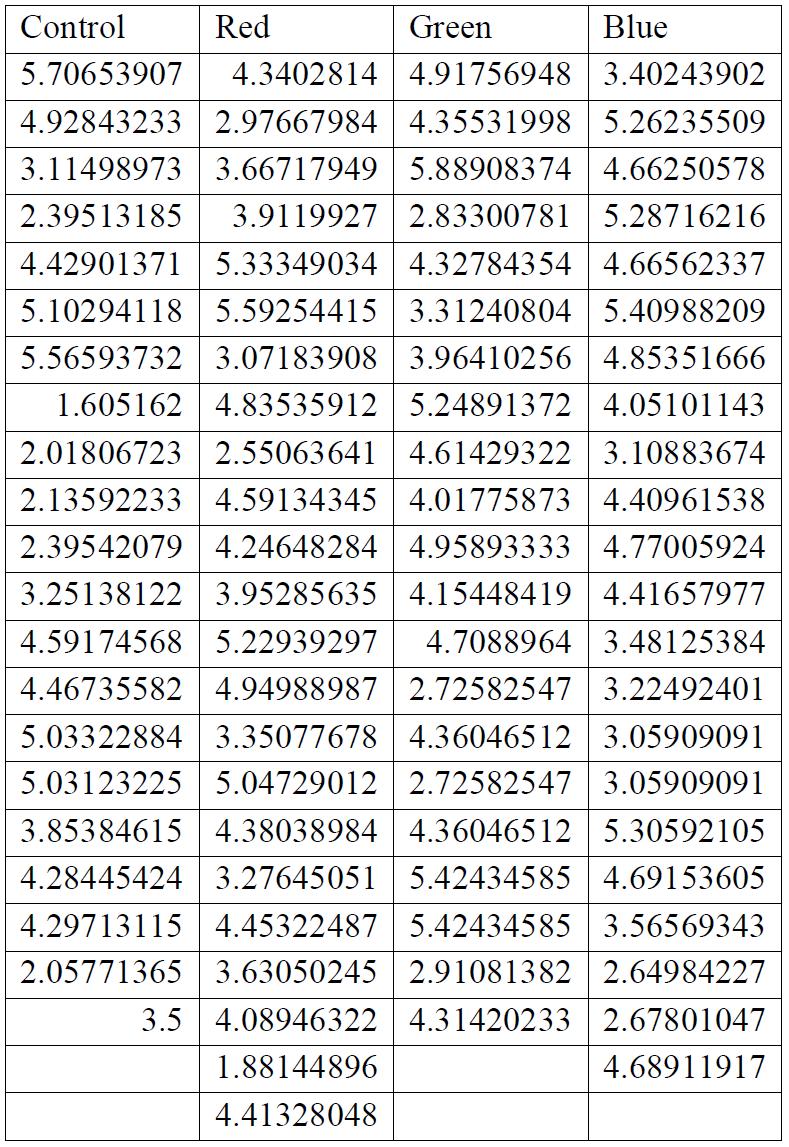 Each light colour had a small variation in its intensity (see appendix for intensity graphs). This means that exposure to each colour can only be compared independently to the control group and not between colours.