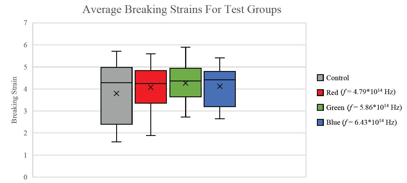 LDPE was irradiated with three different frequencies of light: 4.79 ∗ 1014 Hz (red), 5.86 ∗ 1014 Hz (green) and 6.43 ∗ 1014 Hz (blue). After 128h of exposure, the LDPE was tested for its breaking stress and strain to determine if the frequency of