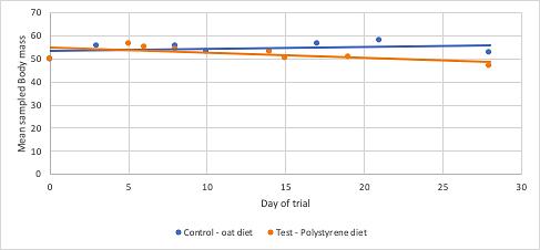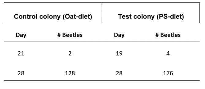 This investigation determined that mealworms are able to successfully mature on a diet predominantly based on expanded polystyrene. Furthermore, results showed that larvae on a PS-diet were able to progress into the pupa and adult, or beetle stage of life at a faster rate than their oat-diet counterparts. This highlights the potential of plastic waste management systems to be implemented that utilise mealworms to degrade potentially harmful plastics.