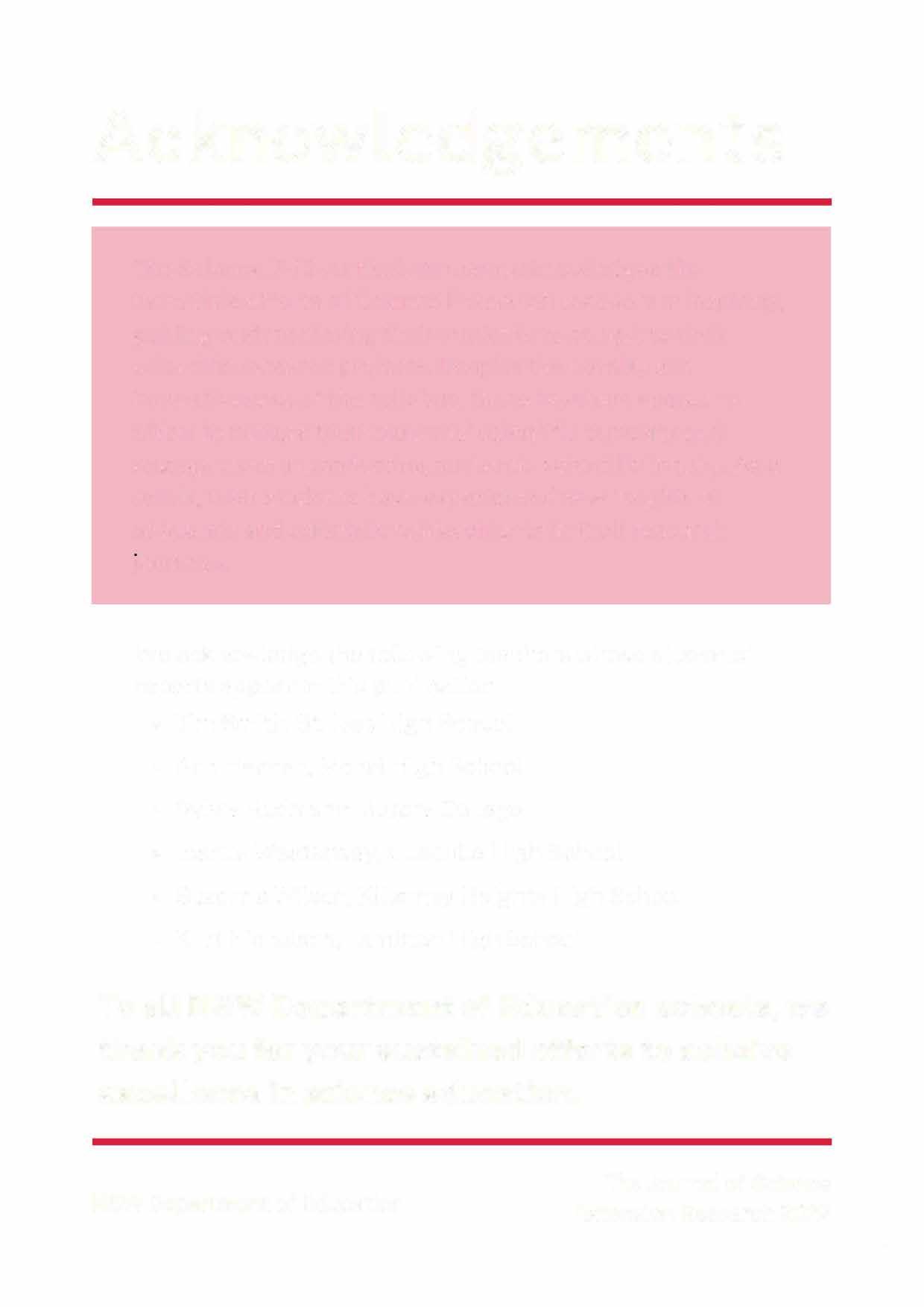 This journal is a showcase of success. It highlights what students can achieve when they are empowered to take risks and back themselves, even when the outcome is unknown. I commend the students, teachers and mentors involved and am sure you will appreciate the curiosity, methodical approach and innovation shown by our NSW Science Extension students.