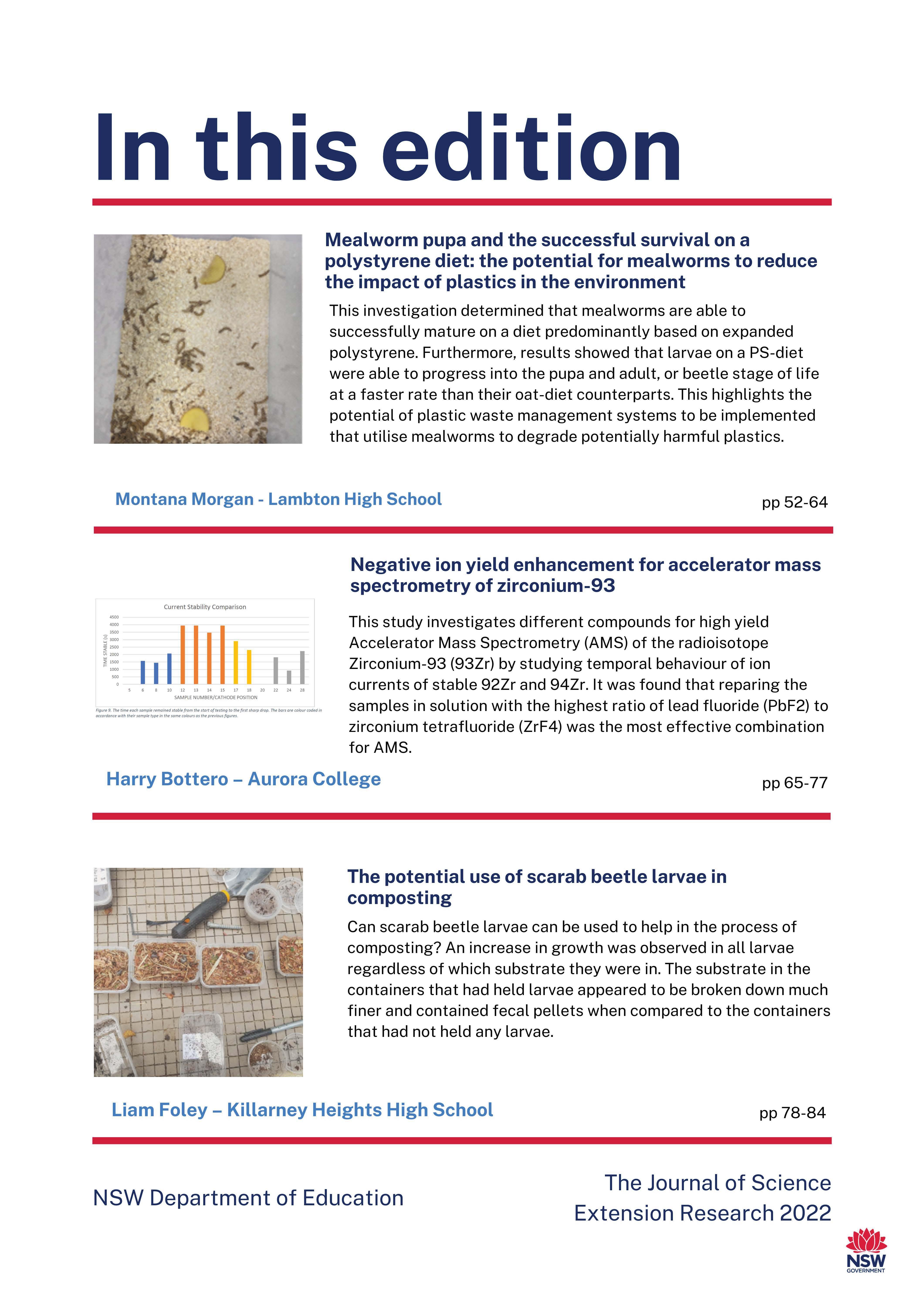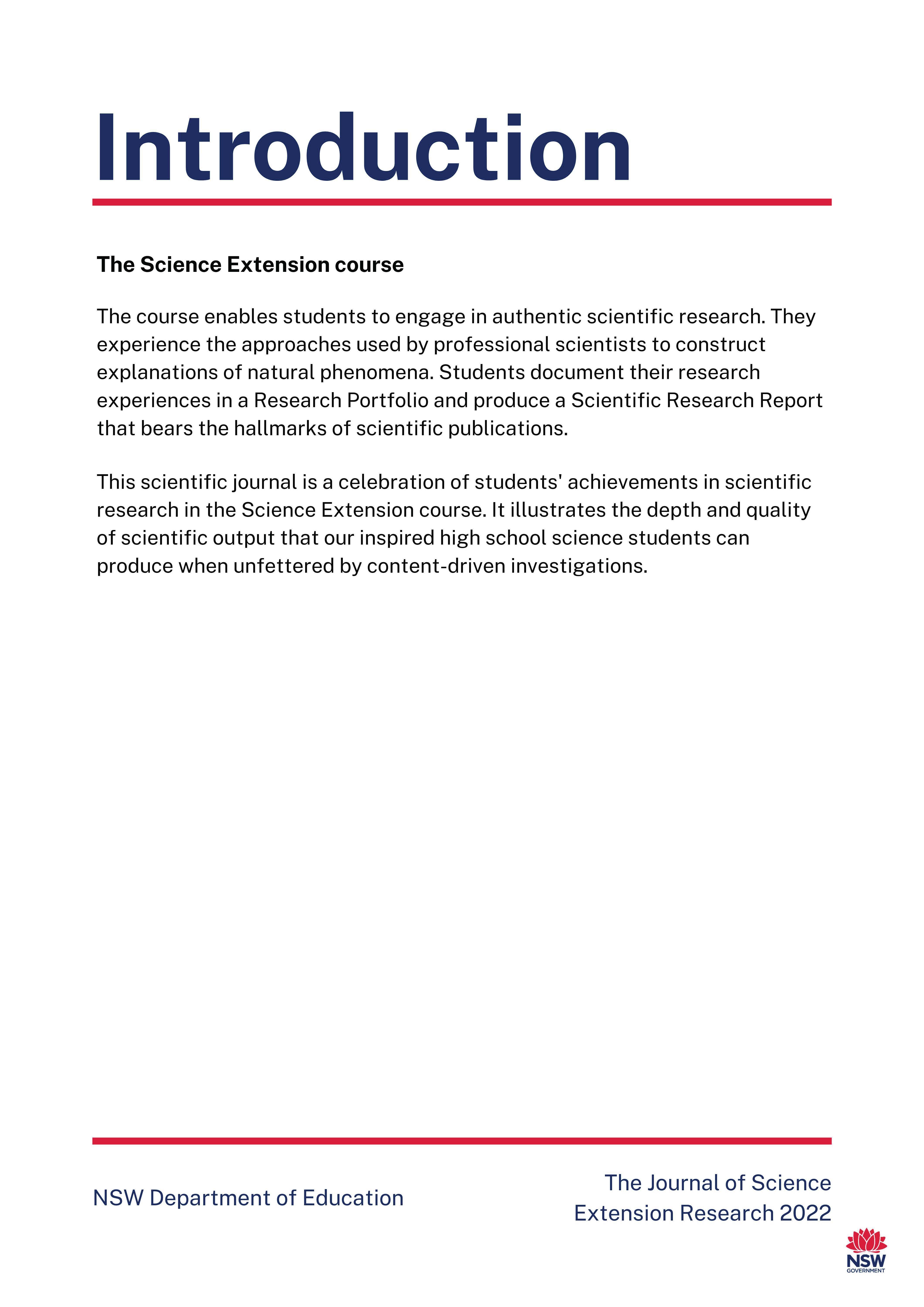 In this inaugural edition, research reports from Science Extension students who completed the course in 2020 and 2021 are included. All reports are the work of students studying in NSW public schools. They have been supported by their teachers and schools, and in some cases, external mentors.