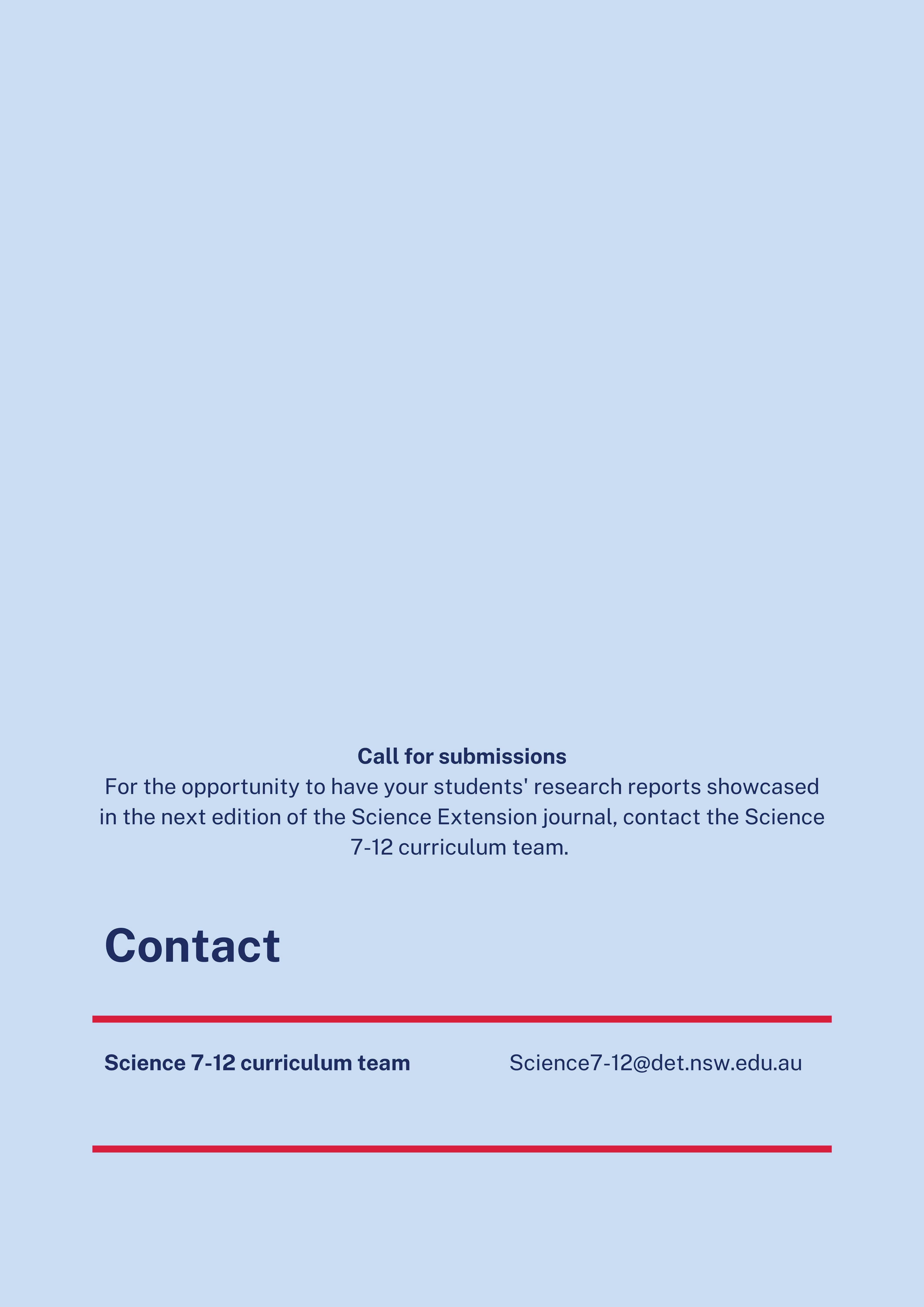 For the opportunity to have your students' research reports showcased in the next edition of the Science Extension journal, contact the Science 7-12 curriculum team.