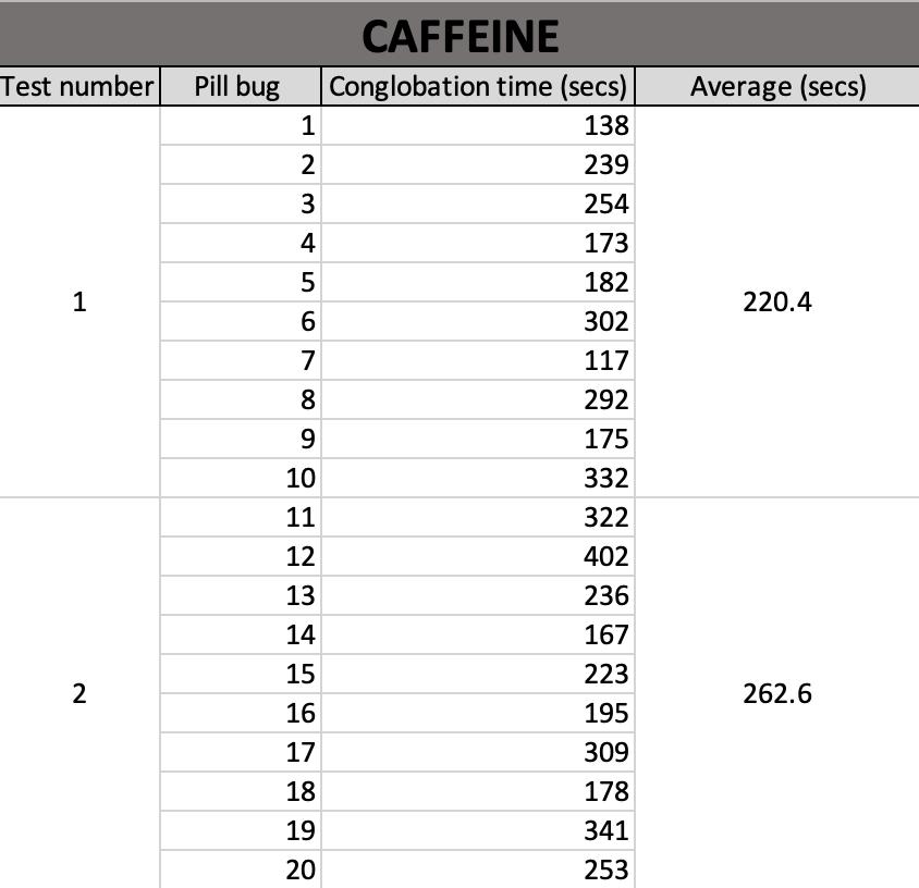 The caffeine group results (seen in table 2), suggests that caffeine increased the conglobation time of pill bugs, which may be related to the diuretic nature of caffeine. This demonstrates the correlation between the nature of caffeine as an inducer of water loss (Stookey, J.), and the conglobation behaviour of pill bugs as a means of water conservation (Jacob T. Smigel and Allen G. Gibbs ), suggesting that caffeine acts as a diuretic in pill bugs, as it does in humans.