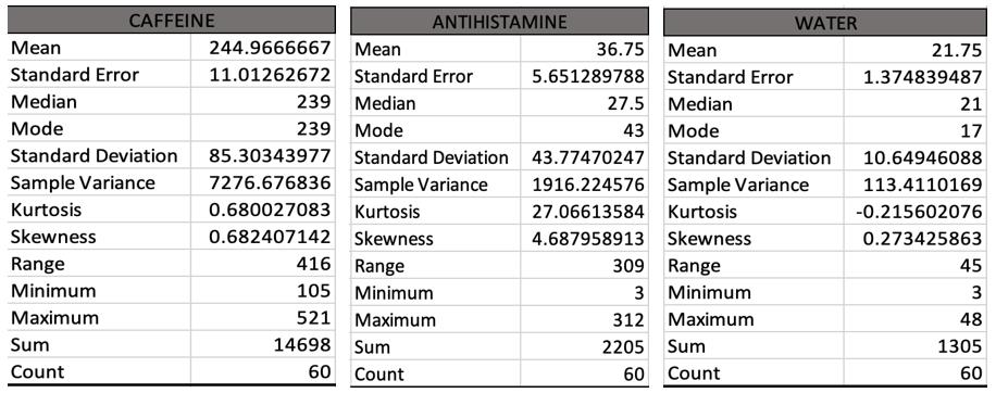 The averages for each drug class were recorded (table 2, figure 2). For the conglobation time, note that caffeine administration results significantly increased time under conglobation. That is, there was an increase of 223.22 seconds between the caffeine and water group.