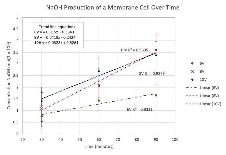 Membrane cells containing electrolytes powered by a potential difference are the primary technology used to produce sodium hydroxide. This report outlines an investigation into the effect of voltage on the rate of sodium hydroxide production in membrane cells.