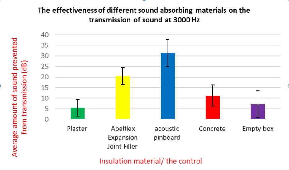 This investigation aimed to determine which sound absorbing material (concrete sheets, plaster sheets, acoustic pinboard and Abel flex Expansion Joint Filler) prevents transmission of sound when tested at a frequency of 3000 Hz. Acoustic pinboard was found to be the most effective in preventing sound transmission. This product would be most useful for controlling sound levels for environments like offices or sound rooms.