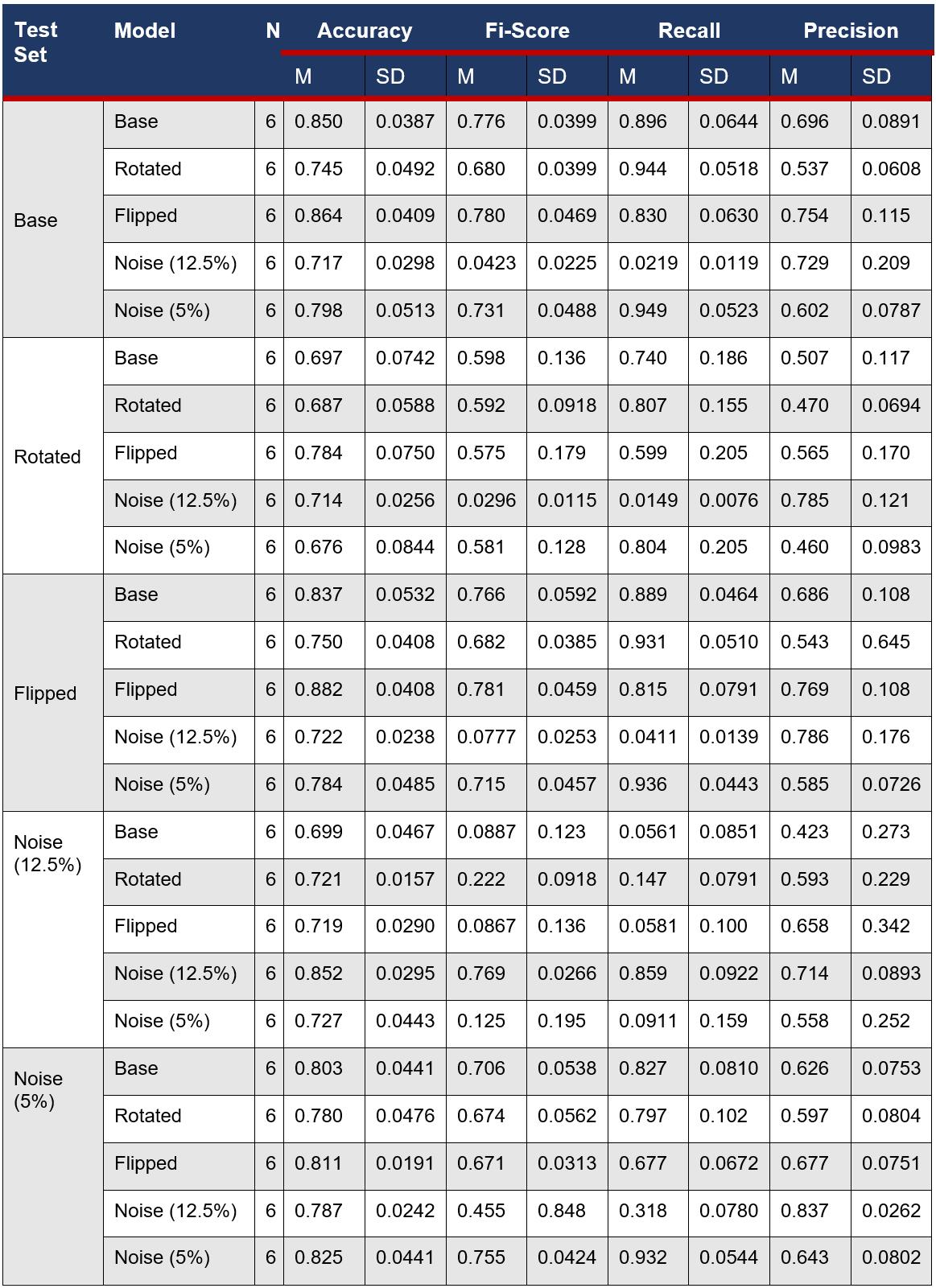 evaluated for the F1-score, the Base model outperformed most of the other models. For F1-Score, the Rotated model (t(6) = 1.95, p = .0402) and 12.5% Noise model (t(6) = 0.353, p = 1.39E-07) had a statistically significant improvement in the 12.5% noise test set (Base: M = 0.0887, SD = 0.123, Rotated: M = 0.222, SD = 0.0918, 12.5% Noise: M = 0.769, SD =0.0266). The mean F1-score and the mean Accuracy of the retrained models in 14 out of 16 cases were found to not be significantly improved over the Base model’s performance. This suggests that the retrained models as a whole had poor ability to generalise, leading to the null hypothesis being accepted. However, there are some notable anomalies which defy this trend that will be further discussed in the discussion.