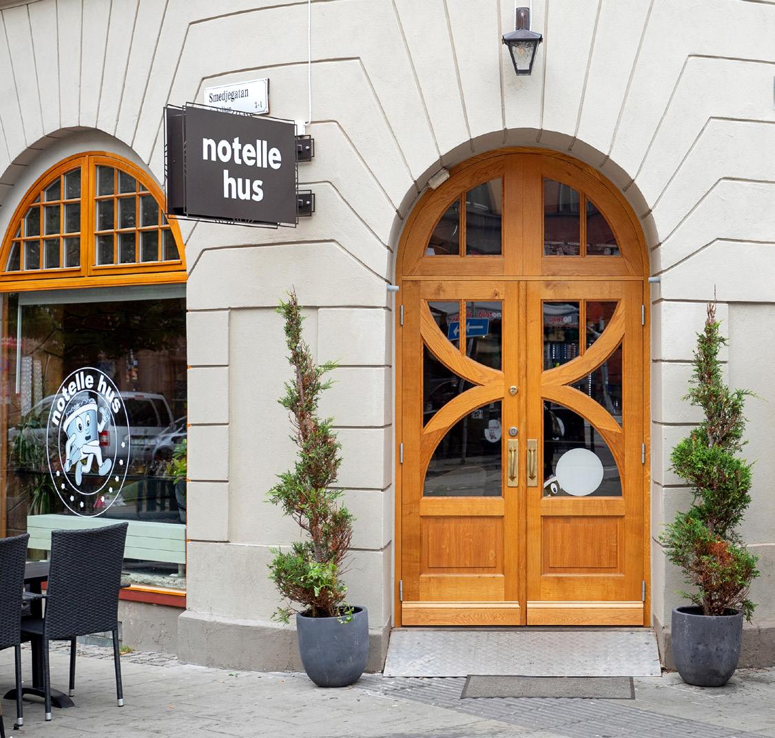 Denna fina fastighet i Stockholm fick en totalrenovering när entrédörrar och butikspartier i aluminium byttes ut mot oljade ekpartier med äkta ekpanel. Så enkelt och så vackert på samma gång. Samtliga partier och täcklister tillverkades på DOFAB SPECIALSNICKERI. Partier och draghandtag 1433 oljades i fyra lager med UVR-skyddande olja med ett sista lager matt finish. Sparkplåtar i rostfritt stål. Samtliga trösklar handikappanpassade i aluminium för hållbarhet och tillgänglighet. Trycke till entrédörrar i modell ASSA 6696.