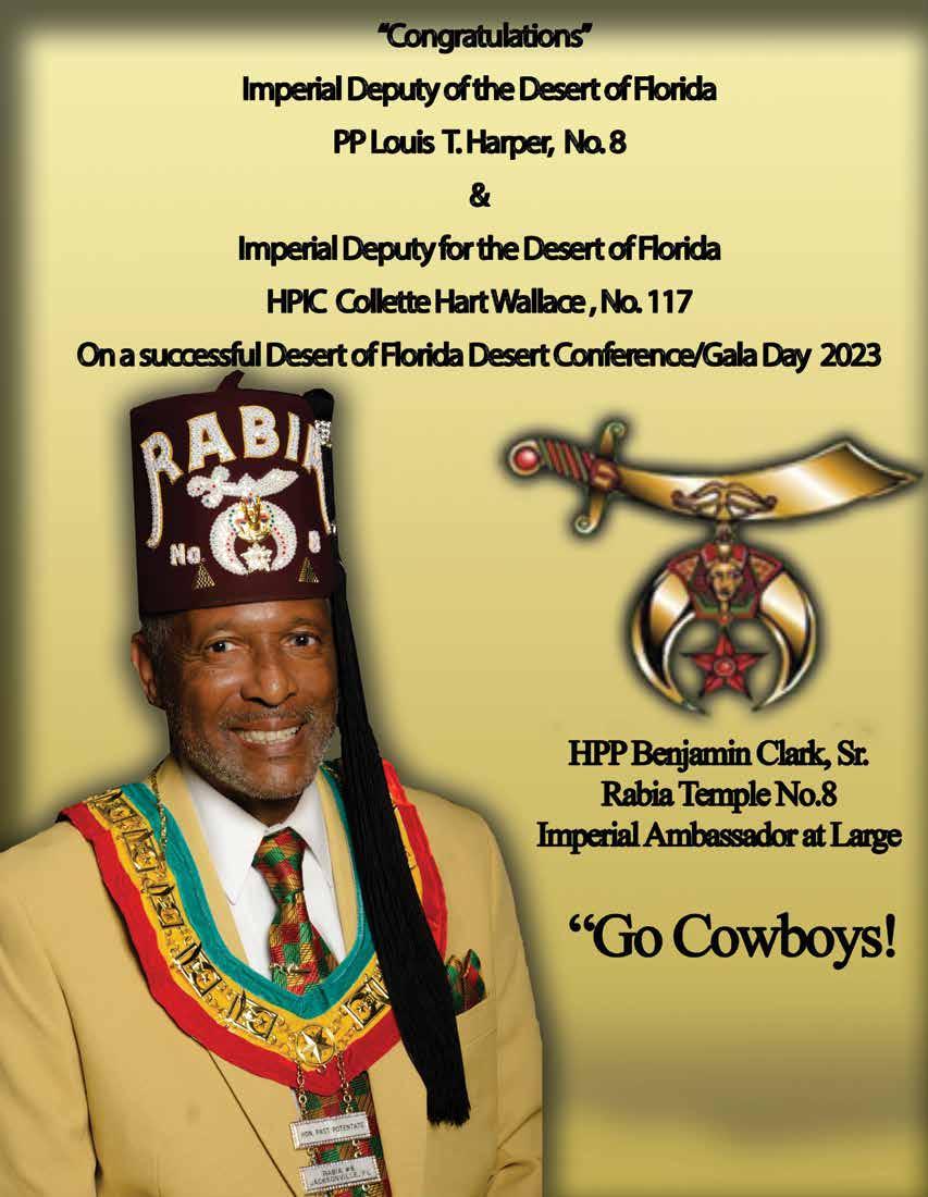 To all the Elected Imperial Council/Court Officers, Appointed Imperial Council/Court Officers, Illustrious Potentates and Illustrious Commandresses, Desert of Florida Nobles and Daughters, Desert Youth, and all the visiting Nobles and Daughters who have traveled to the Desert of Florida to celebrate our Desert of Florida Desert Conference/Gala Day 2023, thank you for supporting the Desert of Florida Desert Conference/Gala Day 2023.