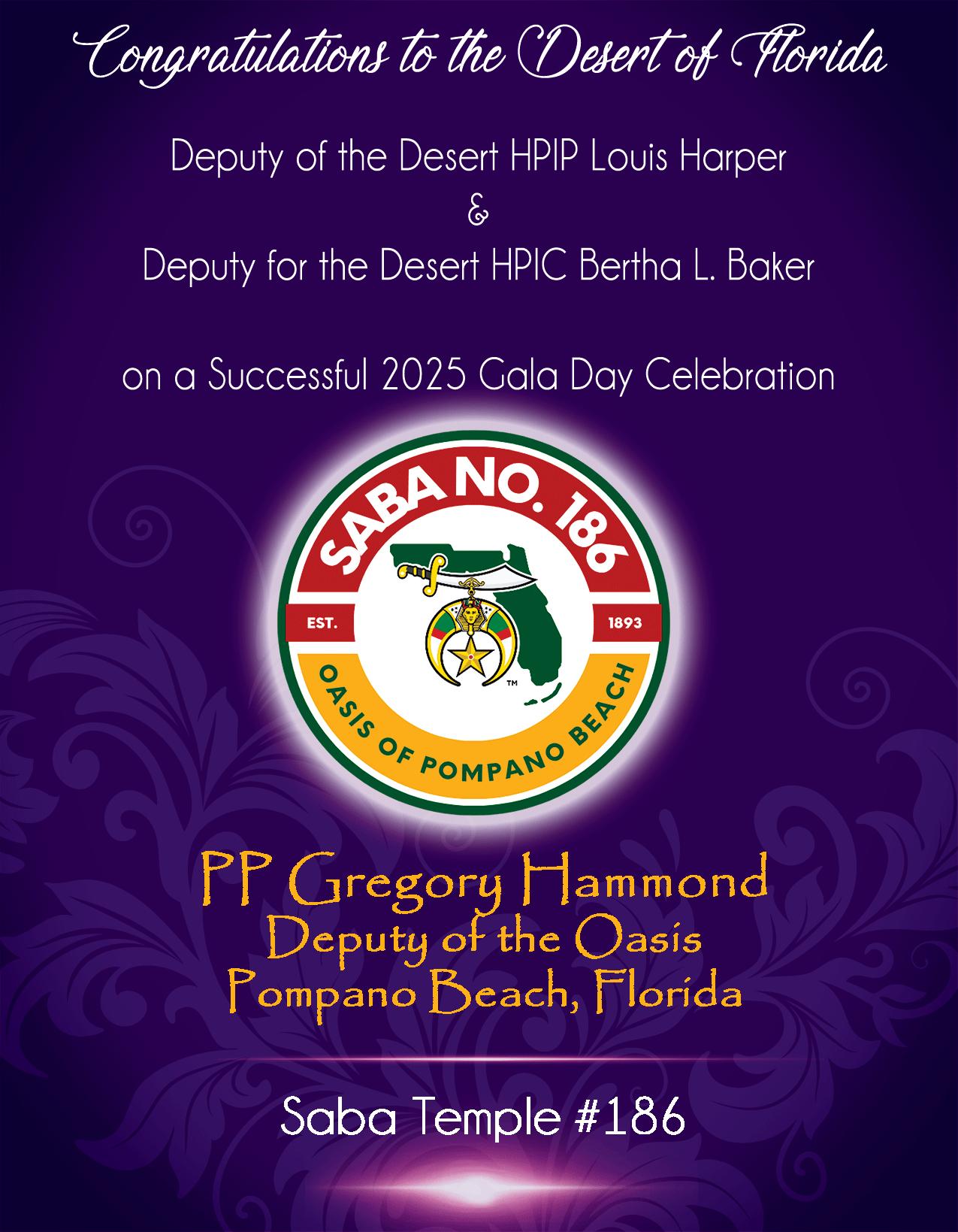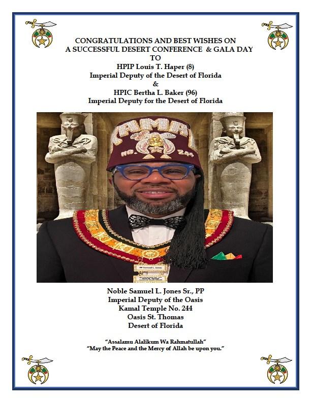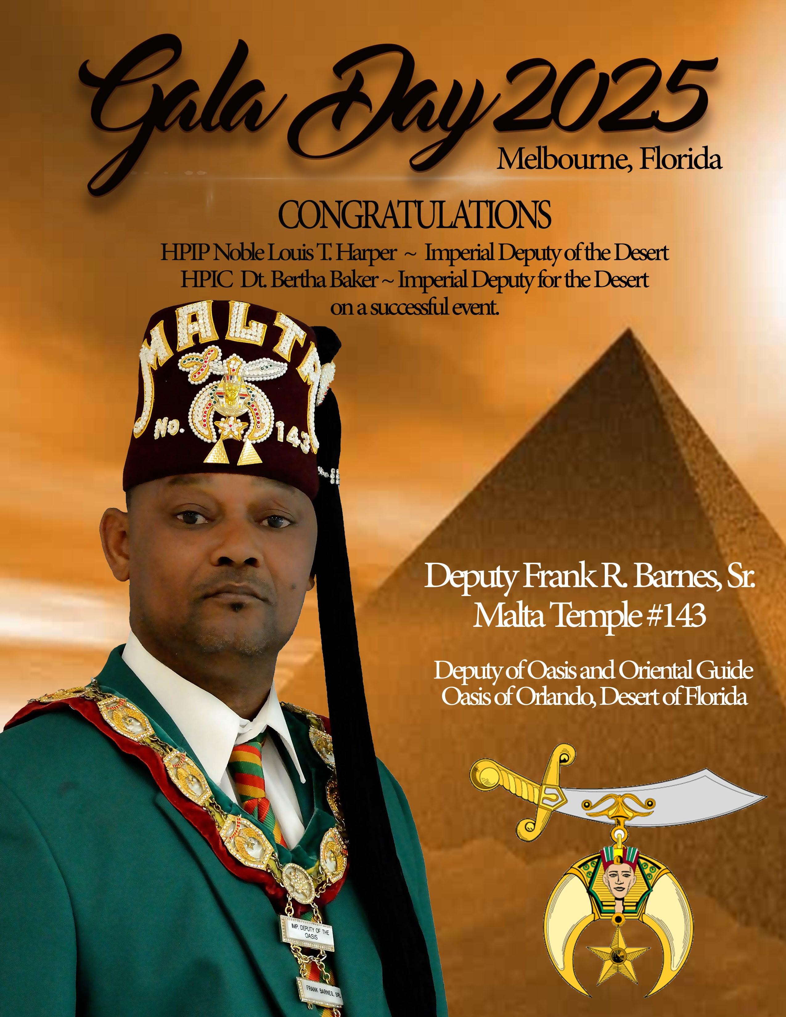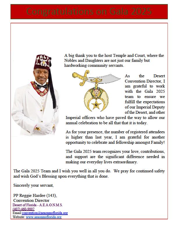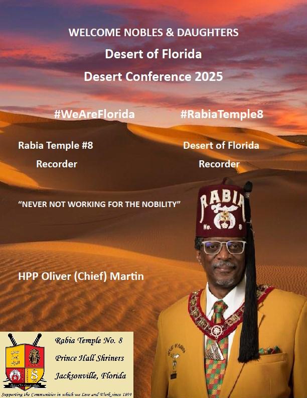 It is my absolute pleasure to extend a heartfelt welcome to each of you as we launch the 2025 Desert Conference Gala Day here in the beautiful Oasis of Melbourne, Florida The Harbour City. As we ignite the engines of fellowship, tradition, and purpose, let us reflect on the vibrant momentum of the Desert of Florida, where impactful service projects and community engagement continue to light the way forward.