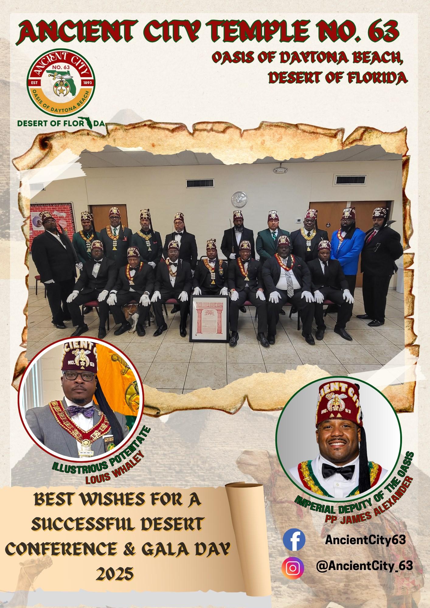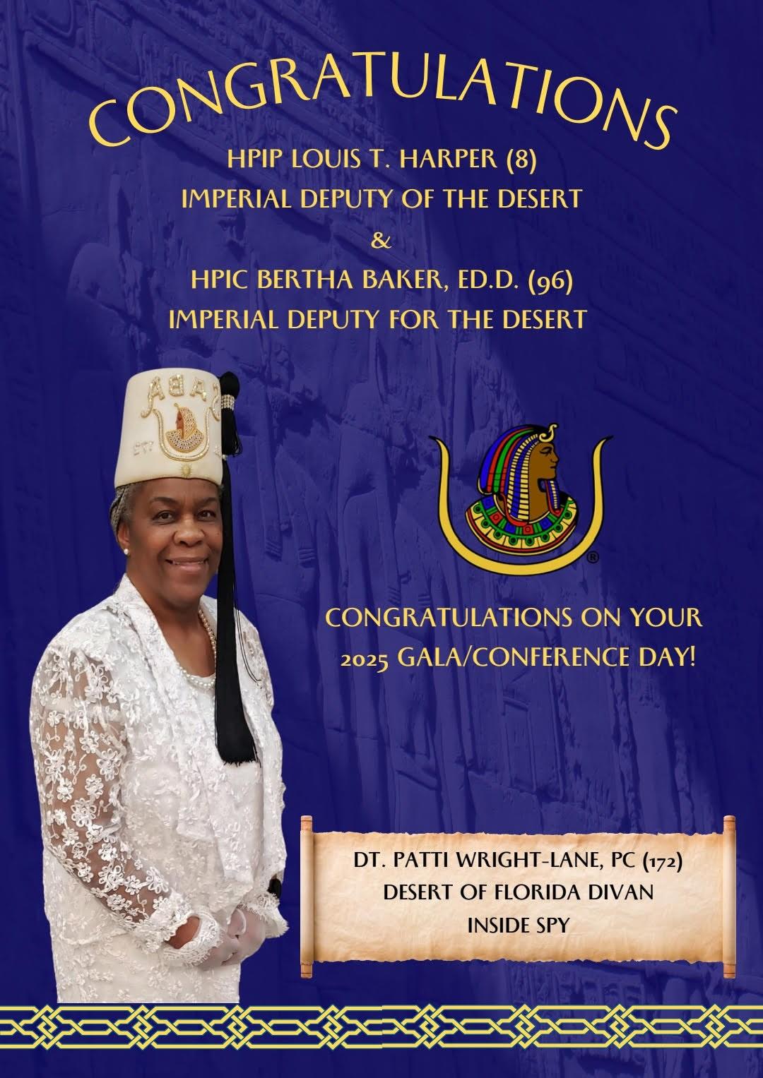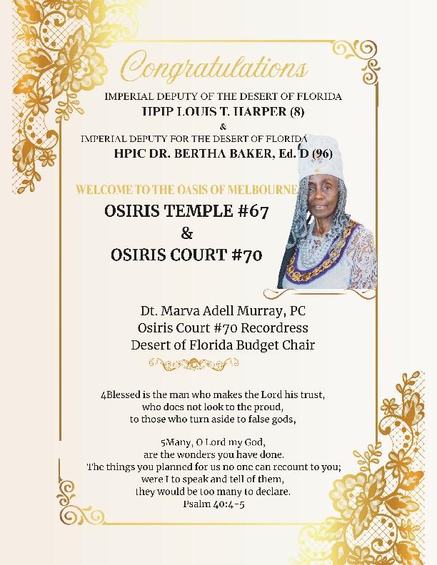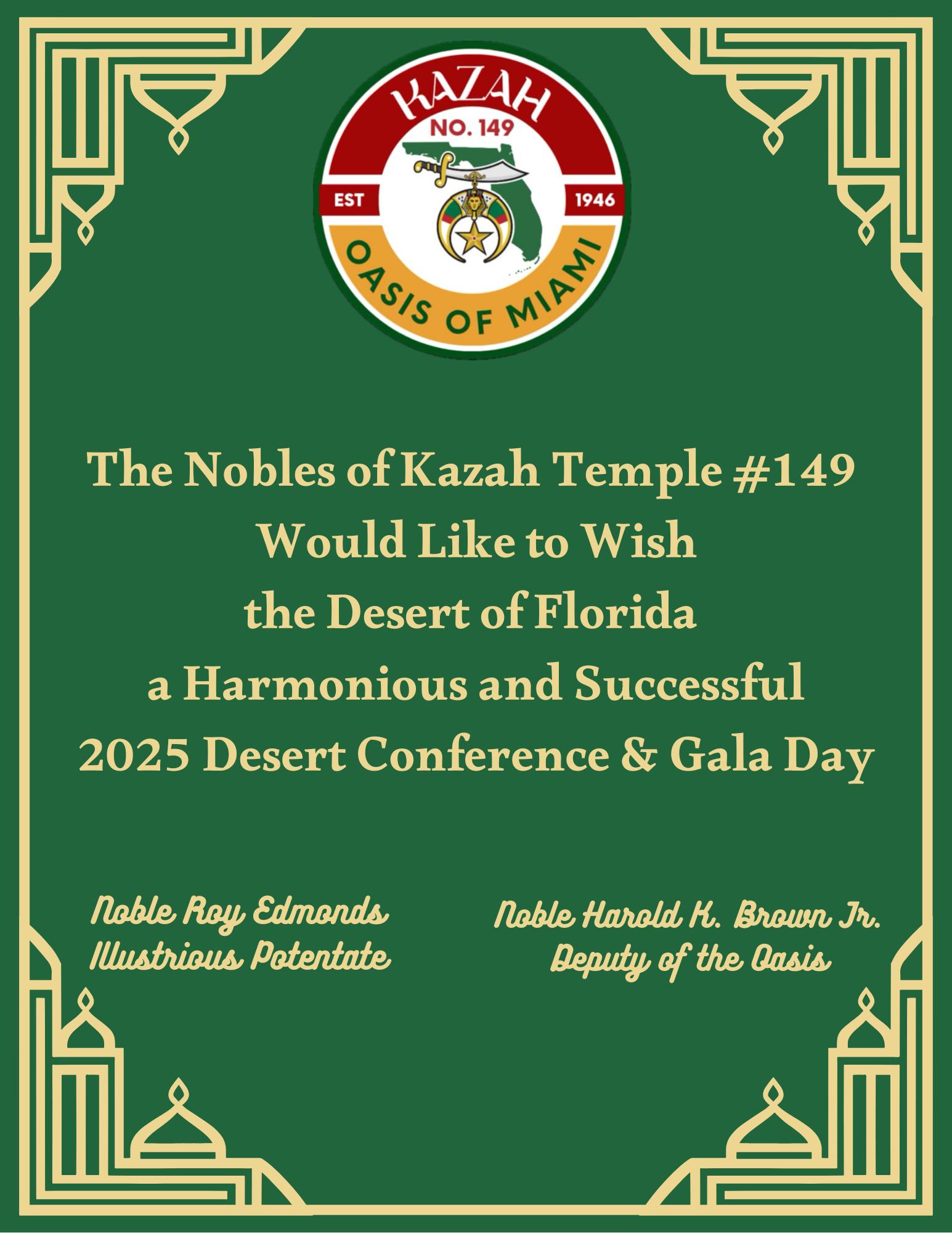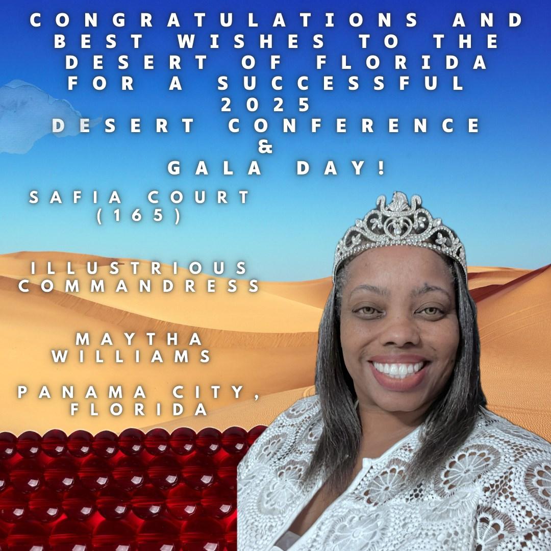I would like to express deep appreciation to Osiris Temple No. 67 and Osiris Court No. 70 for their tireless efforts in making this Desert Conference and Gala Day a vibrant, inspiring experience. Their planning has been a journey with twists, turns, and triumphs, but their dedication has brought us all to this successful destination.