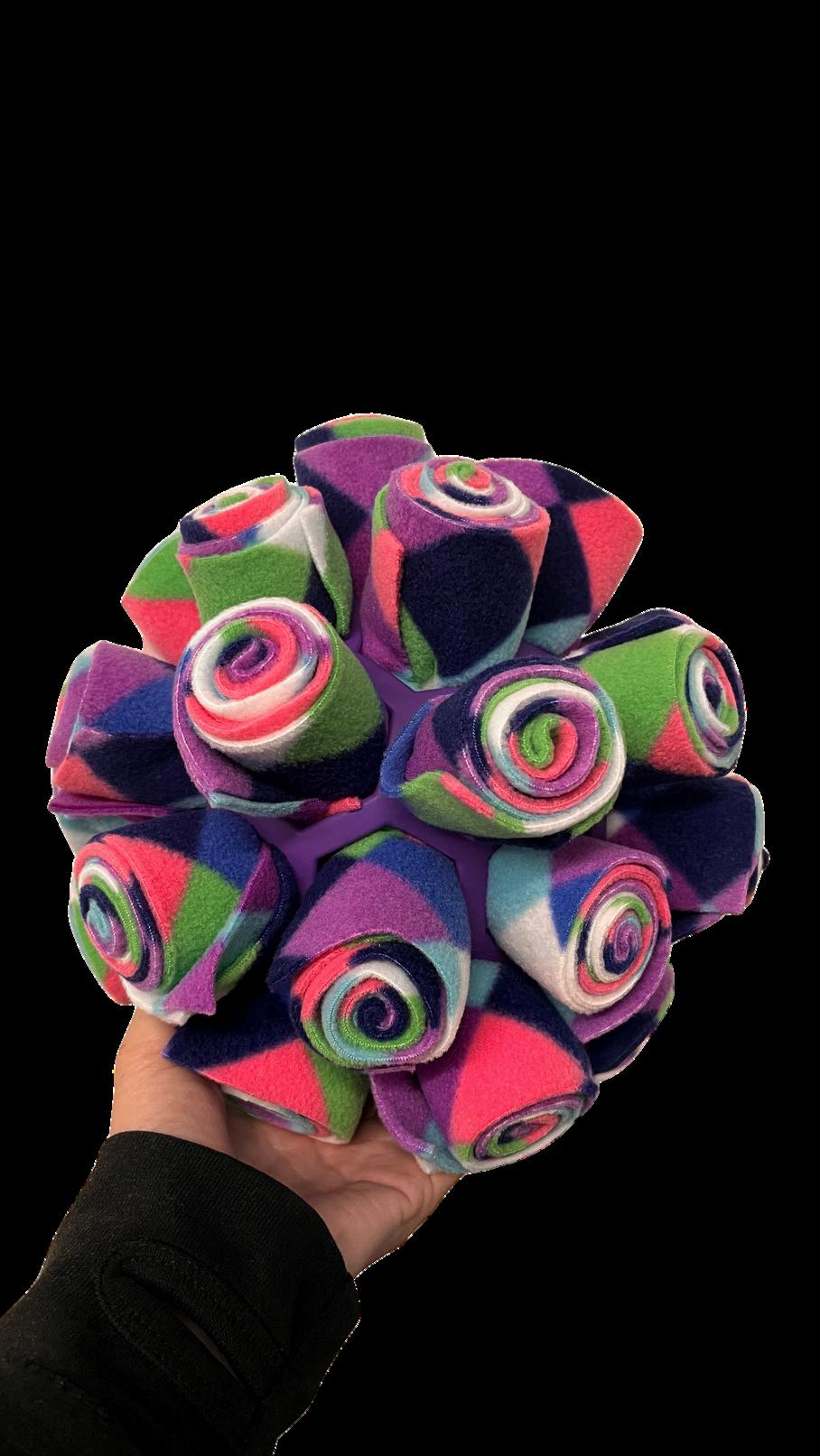 In the final variation we are going to combine the best of both worlds. For this option we are going to need some treats, toilet roll inners, some chew toys and some fabric/tea towel. We are going to lay the fabric flat lenghways, pop some treats inside and fold over and pull thrpugh our ball so that our dog can pull out. We are going to add some toilet rolls with treats as we did in the option above and we are also going to pop a few chew toys in there e.g. nylabone, yak chew, forth glade dental stick, beco bone etc These are great puzzles for mental stimulation, alleviating boredom and can help motivate dogs who arent interested in free feeding