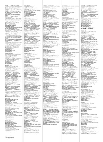 APRIL 27 - SUNDAY CA Chino* (O) LAKE MATHEWS KENNEL CLUB, INC. (S) Prado Regional Park 16700 S Euclid Ave CLOSES: APRIL 9 Jack Bradshaw Dog Shows, SUPT FEE: $30.00-1st/ $25.00-2nd Judges And Their Assignments BEST IN SHOW Mr. R. J. Shreve SPORTING Group: Ms. G. Kerr Col. J. C. Chase: Pntr-GS, Ret-Ches, Ret-Flat, Ret-Lab Mr. H. Falberg: Brit, Pntr-GW, Span-Ckr, Vizs, Weim, Wirehair Ptg Grif Mrs. S. S. Hedgepath: Pointer, Ret-Curl, RetGold, All Setters, Set-Irsh Rd&Wh, Span-Eng Ckr, Span-Wel Spr Ms. G. Kerr: Balance of Sporting Breeds *No Classes: Span-Eng Spr HOUND Group: L. L. Nelson Mr. H. Falberg: Basset Mr. G. D. Boulton: Basenji, Bgle, Dach, Ir Wolf, RhoRidge, Saluki, Whip L. L. Nelson: Balance of Hound Breeds WORKING Group: Mrs. F. Strauss Ms. G. Kerr: Boxer, Dobe Mr. R. J. Shreve: Alas Mal, AnatolShep, Berns Mtn, Blk Russn Terrier, Mast, Sib Hky, Std Schn, Tibtn Mastiff Mrs. F. Strauss: Balance of Working Breeds TERRIER Group: Ms. C. J. Seaberg Mr. C. E. Trotter: Wst Highlnd Ms. C. J. Seaberg: Airdle, Austr, Bull Ter, Dandie, Glen Imaal, Irish Ter, Kerry, Lakelnd, Min Bull Terrs, Norwich Norfolk Mr. R. J. Shreve: Balance of Terrier Breeds TOY Group: Mr. C. E. Trotter Mr. R. J. Shreve: Toy Manch Mrs. F. Strauss: Pood Toy Mrs. S. S. Hedgepath: Yorks Mr. C. E. Trotter: Balance of Toy Breeds NON-SPORTING Group: Mrs. F. Strauss Mrs. F. Strauss: Am Esk Dog, Pood Mr. R. J. Shreve: Boston, Shar-Pei Mr. G. D. Boulton: Balance of Non-Sporting Breeds HERDING Group: Mr. C. E. Trotter Mrs. F. Strauss: OES, Pemb-WC Mrs. J. L. Fink: Bel Mal, Bel Shp, Fin Laph, Swed Vallhund Ms. G. Kerr: AustrlShep, Bel Terv, Brdr Coll, Briard, Card-WC, Coll, GSD, Shetld Mr. R. J. Shreve: Balance of Herding Breeds OBEDIENCE TRIAL CLASSES Dr. W. T. Beauchamp: Nov A, Nov B, Open A, Util A, Util B, Versatility Ms. G. Grissom: Begnr Nov A, Begnr Nov B, Grad Novr, Open B, Grad Openr JR SHOWMANSHIP: Ms. C. J. Seaberg SWEEPS PUPPY: Pharaoh Ms. Gay Dunlap SWEEPS VETERANS: Pharaoh Ms. Gay Dunlap CA City of Industry* (O) ENGLISH SPRINGER SPANIEL CLUB OF SAN FERNANDO VALLEY (S) Industry Hills Exposition Center 16200 Temple Ave CLOSES: APRIL 9 Mrs. Eileen Parr, SHW SEC, 18780 Munsee Rd, Apple Valley, CA 92307 FEE: $30.00-1st/ $16.00-2nd Mrs. B. Hayes: Breed, Jr. Showmanship Ms. K. Moore: Obedience SWEEPS PUPPY Ms. Karen Detterich CA Lodi (O) GREAT DANE CLUB OF NORTHERN CALIFORNIA, INC. (S) Sycamore Lane Kennels 5111 West Sargent Road CLOSES: APRIL 9 Debi Best, SHW SEC, 2463 EASY ST, SAN LEANDRO, CA 94578 FEE: $28.00-1st/ $18.00-2nd SWEEPS PUPPY Mr. R C Williams CA Sacramento (O) SACRAMENTO SIERRA ST. BERNARD CLUB (S) Red Lion Hotel Sacramento Red Lion Hotel Sacramento at Arden Village 1401 Arden Way CLOSES: APRIL 9 Debi Best, SHW SEC, 2463 Easy St, San Leandro, CA 94578 FEE: $27.00-1st/ $13.00-2nd Mr. J. M. Fankhauser: Breed, Jr. Showmanship SWEEPS PUPPY Mr. Mike Dugan CO Denver (I) ROCKY MOUNTAIN SIBERIAN HUSKY CLUB Crowne Plaza Hotel Denver Airport 15500 East 40th Avenue I-70 East CLOSES: APRIL 9 Jan D Curtis, SHW SEC, 2837 W. 49th Street, Evans, CO 80620 Ms. D. Beckman: Breed, Jr. Showmanship