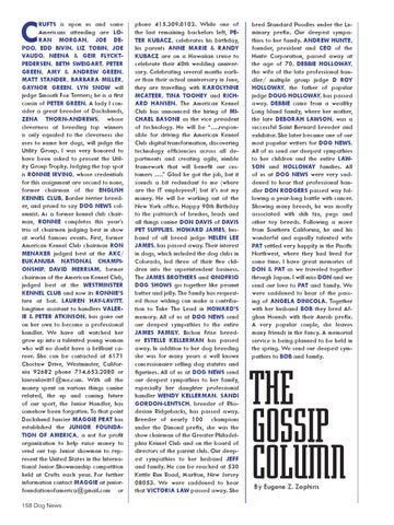 bred Standard Poodles under the Luminary prefix. Our deepest sympathies to her family. ANDREW HUNTE, founder, president and CEO of the Hunte Corporation, passed away at the age of 70. DEBBIE HOLLOWAY, the wife of the late professional handler/ multiple group judge D ROY HOLLOWAY, the father of popular judge DOUG HOLLOWAY, has passed away. DEBBIE came from a wealthy Long Island family, where her mother, the late DEBORAH LAWSON, was a successful Saint Bernard breeder and exhibitor. She later became one of our most popular writers for DOG NEWS. All of us send our deepest sympathies to her children and the entire LAWSON and HOLLOWAY families. All of us at DOG NEWS were very saddened to hear that professional handler DON RODGERS passed way following a year-long battle with cancer. Showing many breeds, he was mostly associated with shih tzu, pugs and other toy breeds. Following a move from Southern California, he and his wonderful and equally talented wife PAT settled very happily in the Pacific Northwest, where they had lived for some time. I have great memories of DON & PAT as we traveled together through Japan. I will miss DON and we send our love to PAT and family. We were saddened to hear of the passing of ANGELA DINICOLA. Together with her husband BOB they bred Afghan Hounds with their Anrob prefix. A very popular couple, she leaves many friends in the fancy. A memorial service is being planned to be held in the spring. We send our deepest sympathies to BOB and family.