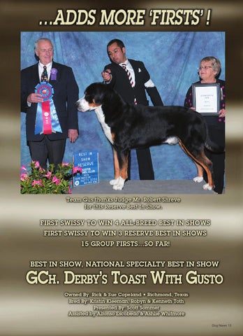 GCh. Derby’s Toast With Gusto Owned By: Rick & Sue Copeland • Richmond, Texas Bred By: Kristin Kleeman, Robyn & Kenneth Toth Presented By: Scott Sommer Assisted by Alfonso Escobedo & Ashlie Whitmore Dog News 13