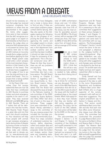 JUNE DELEGATE MEETING that do not have Delegates and a study is being done to find out why. If there are event plans problems please contact Dennis Sprung. Alan Slay also spoke at the Delegate meeting the following day on the progress of improving the Event Plans and approving the events and the judges’ panel in a timely manner. Lots of the employees in that department have worked overtime and the work flow has been modified. It should not take more than 8 days for processing of the applications. This is the lowest turnaround since 2011. Please let Alan Slay know if there are still any problems you may have. The Dog Show Rules Committee also had a very busy session. The AKC Board is working on Chapter 2, Section 3 regarding territory issues-Facility vs. Territory. Board Liaison, Harvey Wooding, previously had stated that the Board had discussed this issue at length in the February meeting. A sub-committee of the DSRC headed by Duane Butherus and Harry Miller had done lots of work on this issue of territories. These suggestions were submitted to the Board. Harvey submitted a recap to the committee of the very massive project that included the four-step process to the territoriality issue. Those four steps consisted of understand customer behaviors, define objectives, collect and analyze data and draw conclusion and submit proposals. Under the Collect and Analyze section there were very interesting statistics. In 2013, there were a