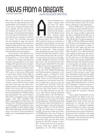 while dog registrations are aligned with the first four months of 2013. As of April there is a 0% drop in dog registrations. There is $108 million in investments on the balance sheet with $70 million in pension and $14 million ear marked for future use. Doug Lundgren stated that the AKC is celebrating the 20th year of AKC Agility. Agility started at Crufts in 1978 with the KC of England adopting it in 1980. In 1986 the USDAA was started. In 1993 there was the beginning of the AKC Advisory committee on Agility. In 1994 the first AKC Agility Trial with one class with three levels of difficulty was held in Houston, TX. In 1996 the first National Agility championship was held in Tulsa, OK. And in the same year we sent the first AKC team to the World Agility Trials. There have also been added three additional classes with the preferred class to accommodate all breeds and handlers. In 1999 the MACH title was introduced. There are now 9 agility organizations in the USA. This is the 2nd sport to exceed 11 million entries in a year. There were 1650 dogs competing in the Agility National Championship in PA. Bob McKowen was the person who organized and conducted the first AKC Agility Event in August 1994. Bob McKowen is still alive and a Delegate. A plaque was given to Bob at the meeting to honor and recognize him for all of his contribution to the sport of agility. He received a standing ovation. It was a good meeting with my only disappointment the defeat of the proposal to allow more professions into the Delegate Body. Clubs should have the opportunity to nominate any of their membership as a Delegate regardless of what profession he or she is involved. Maybe in a future time the Delegate body will allow one or some of these professions and that will follow in the steps of the first woman allowed to be seated as a Delegate. Then and only then will we be inclusive instead of exclusive.
