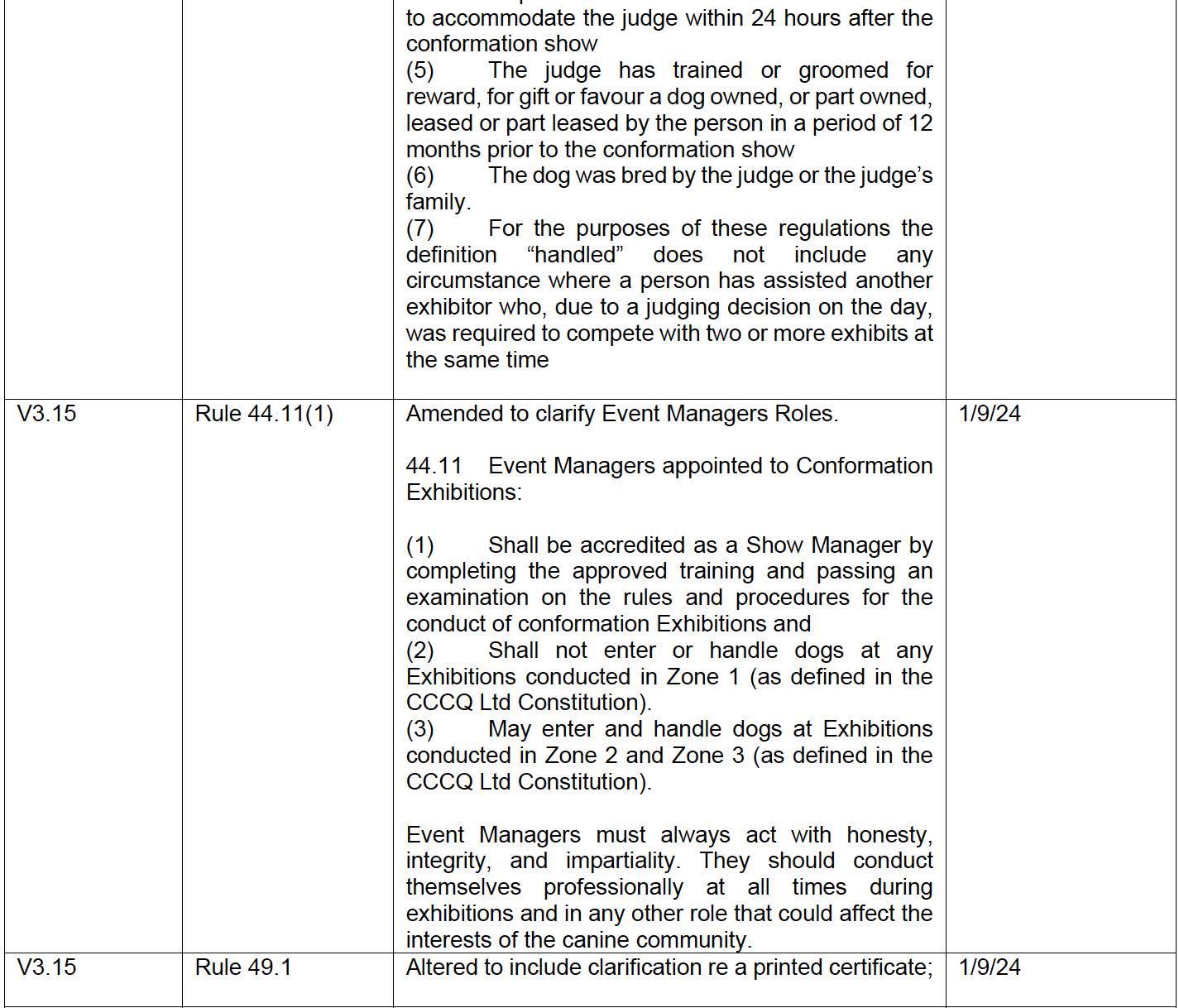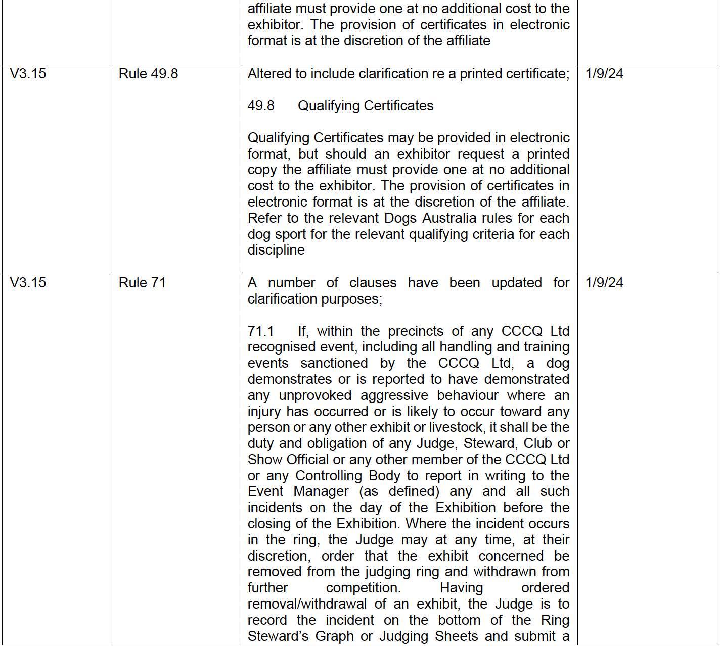 The following changes (effective 1 September 2024) have been made to the Dogs Queensland RULE BOOK. Changes relate to: Rules 20.2(3)ii, 28.1, 40.2, 44.9, 44.11(1), 49.1, 49.7, 49.8, 71, 79.1 and Appendices 6, 7 and 11. All amendments are effective from 1 September 2024.