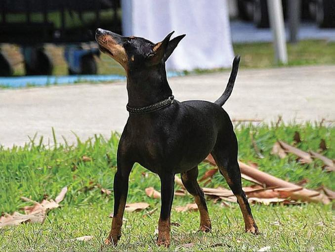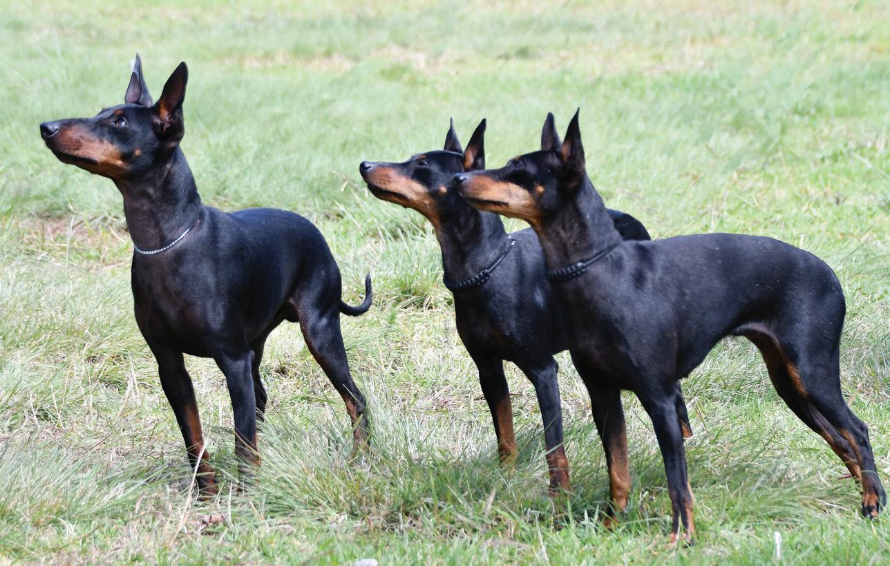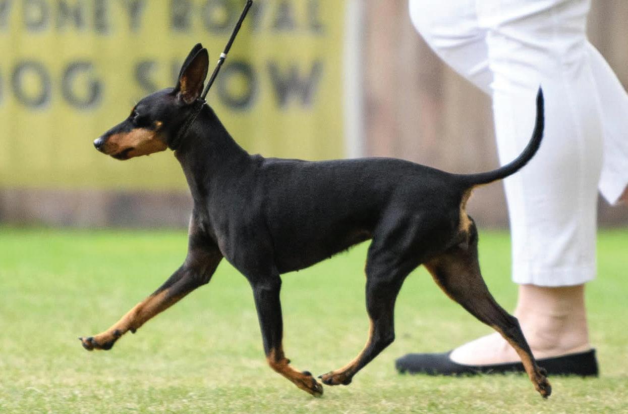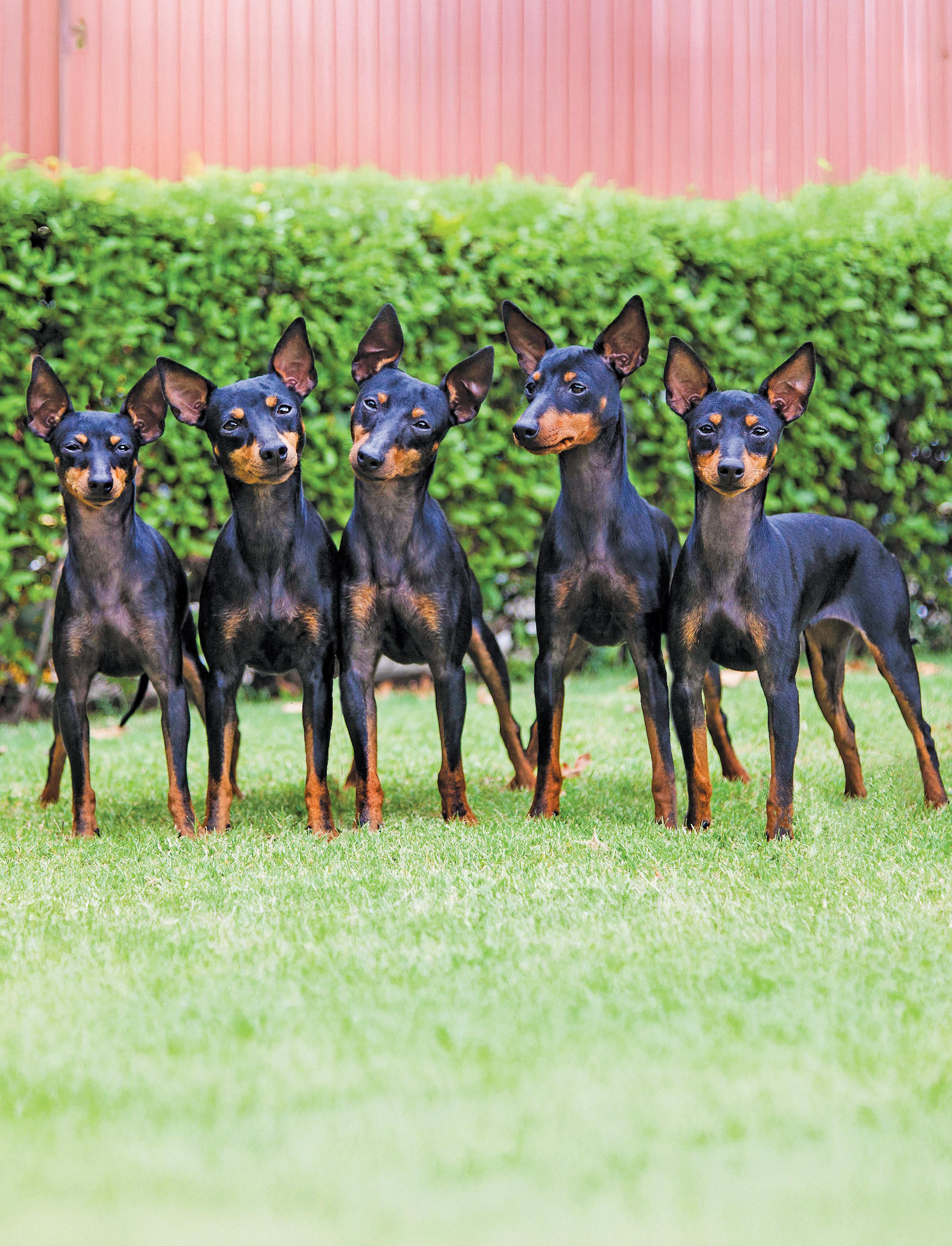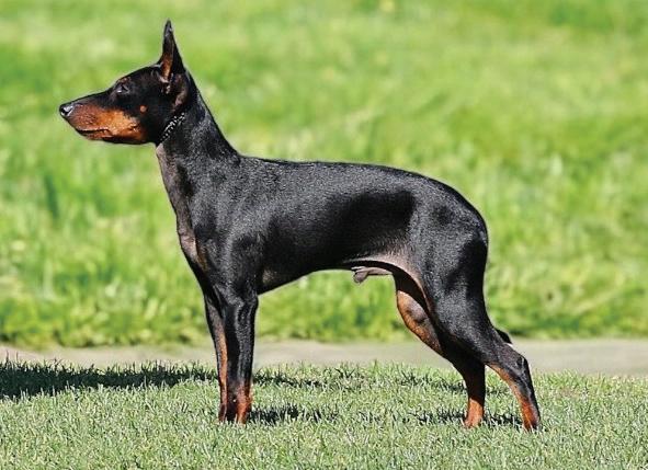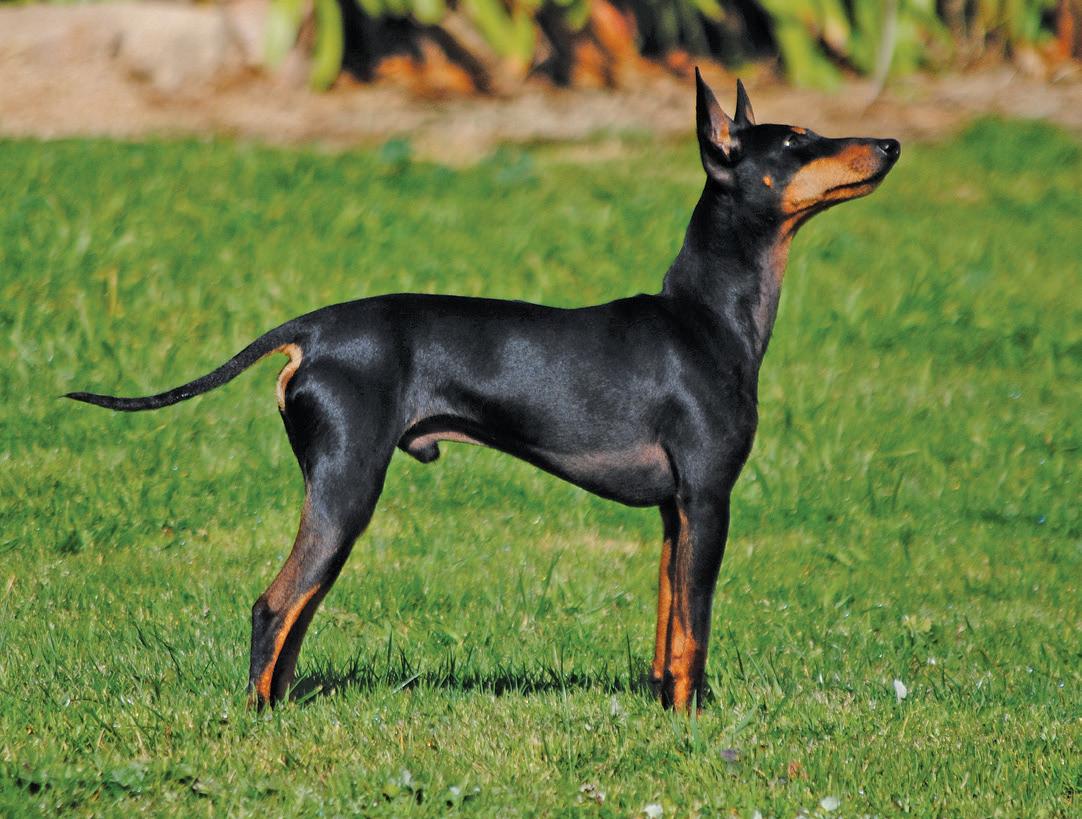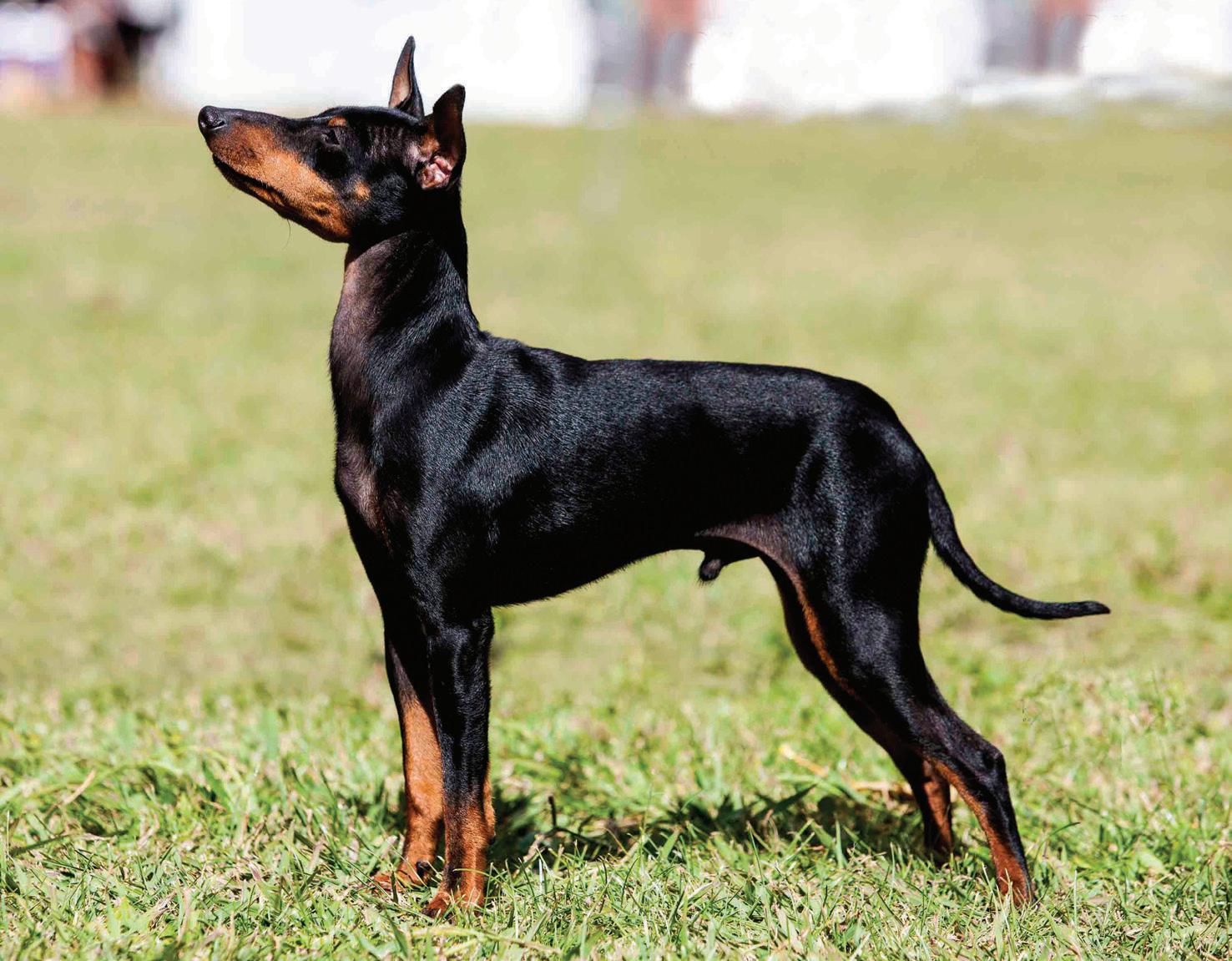 The English Toy Terrier has a short, shiny black coat set off by trimmings of rich redbrown. The breed apparently hasn’t changed much since the 1900s and is recognised by its ‘candle flame’-shaped ears. It is quick of eye, keen of hearing, brave and courageous.