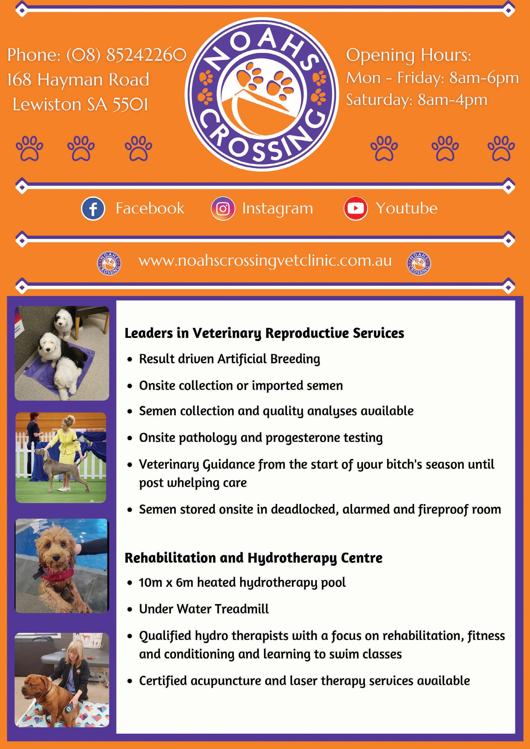 BLAKES CROSSING 41 Village Tce, Blakeview Ph. 08 7231 3000 TOP DOG IN REPRODUCTION AFFORDABLE 24HR EMERGENCY SERVICE CALL US ON 08 7231 3000 BLAKES TIVER ROAD Open Mon to Fri 8AM to 7PM Now Open Sat 8AM to 12PM 5 Tiver Road, Evanston South Ph. 08 7231 3099 Reproduction Services Seasoned knowledge in Breeding & Whelping In-house Progesterone Testing and Pathology TCI, Surgical & Vaginal Artificial Insemination Semen Analysis & Freezing (Based on the Camelot System) Semen Storage Loads of Breeding packages available Surgery Services Desexing Orthopaedics Soft Tissue Surgery Other Services Boarding Facilities Short & Long Term Greyhound Australasia approved facility Ultrasound Services Digital X-Ray Services Hip & Elbow Scoring Puppy Classes www.blakescrossingvet.com.au