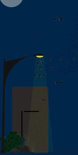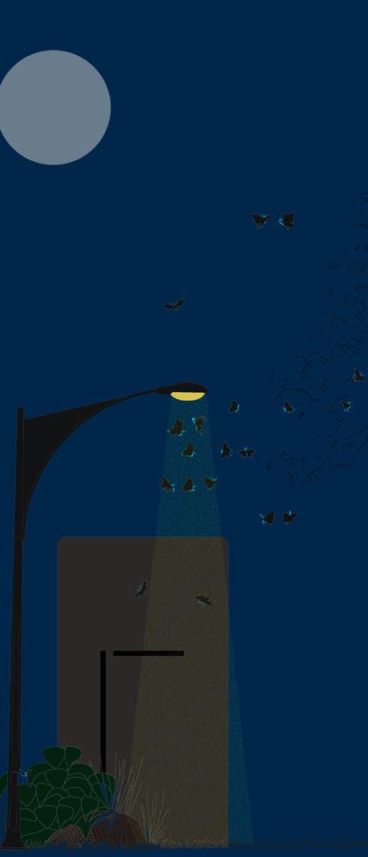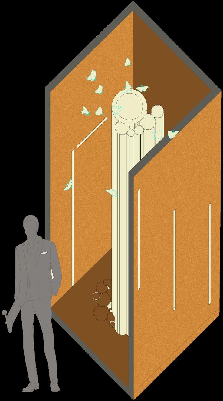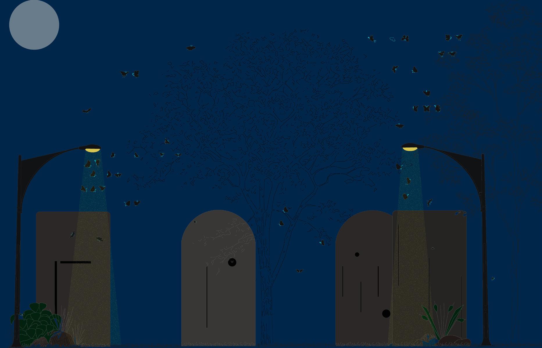 The design includes two types of moth pods, each tailored to the lighting preferences of the moths. The first pod features angled entry points that block light, creating a dark, sheltered space ideal for nocturnal species like the elephant hawk moth. The second pod has openings that allow light to enter, catering to diurnal species like the cinnabar moth, which thrive in well-lit environments. The diagrams illustrate how these structures interact with light, demonstrating their functionality in creating suitable habitats for different moth species.