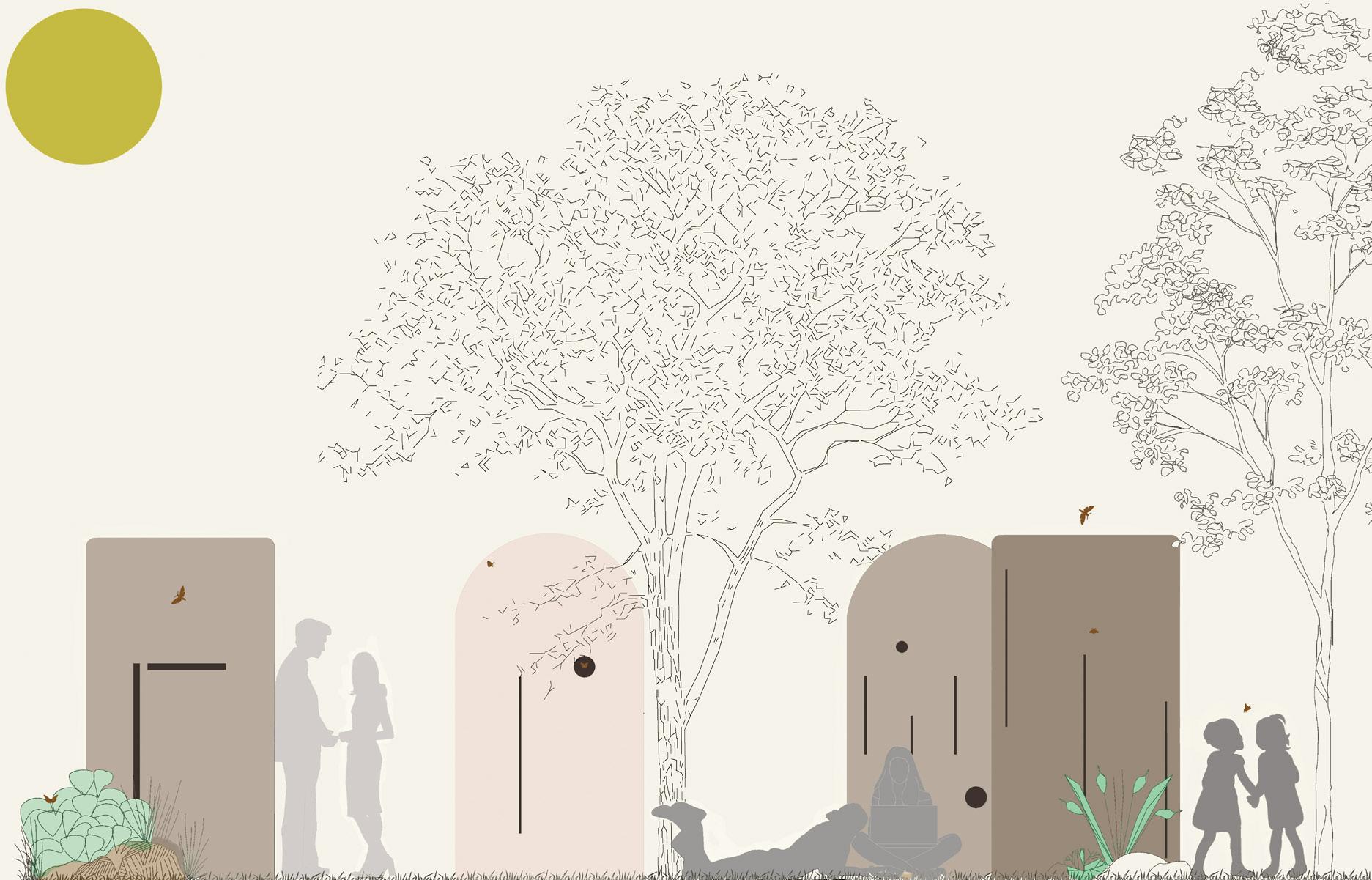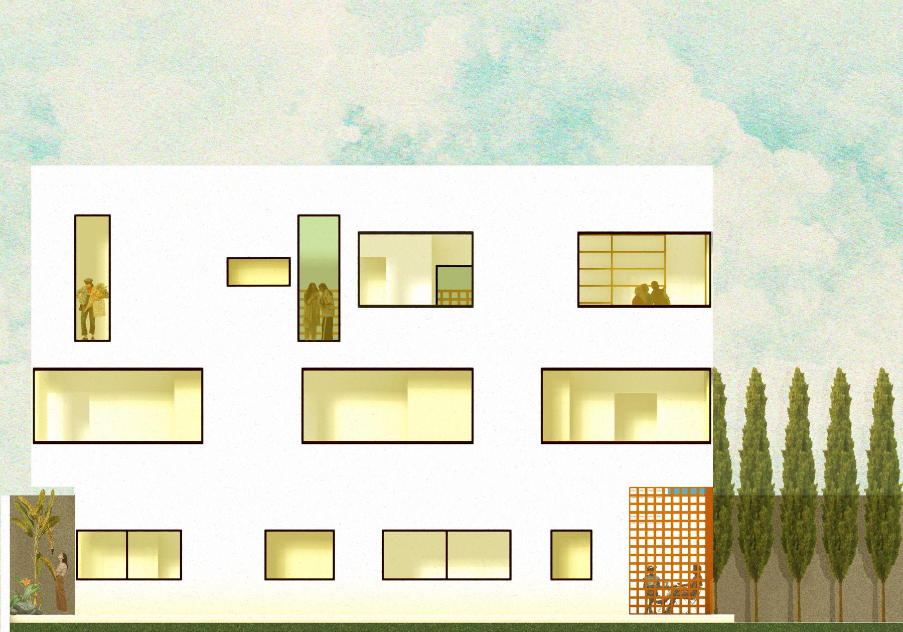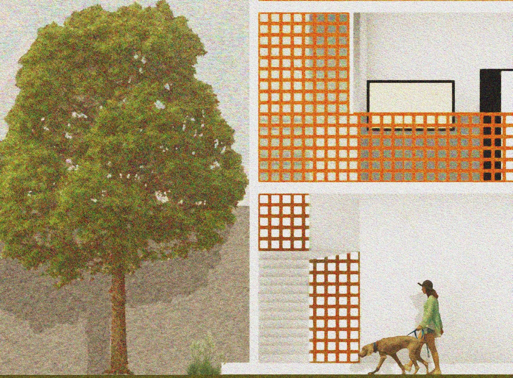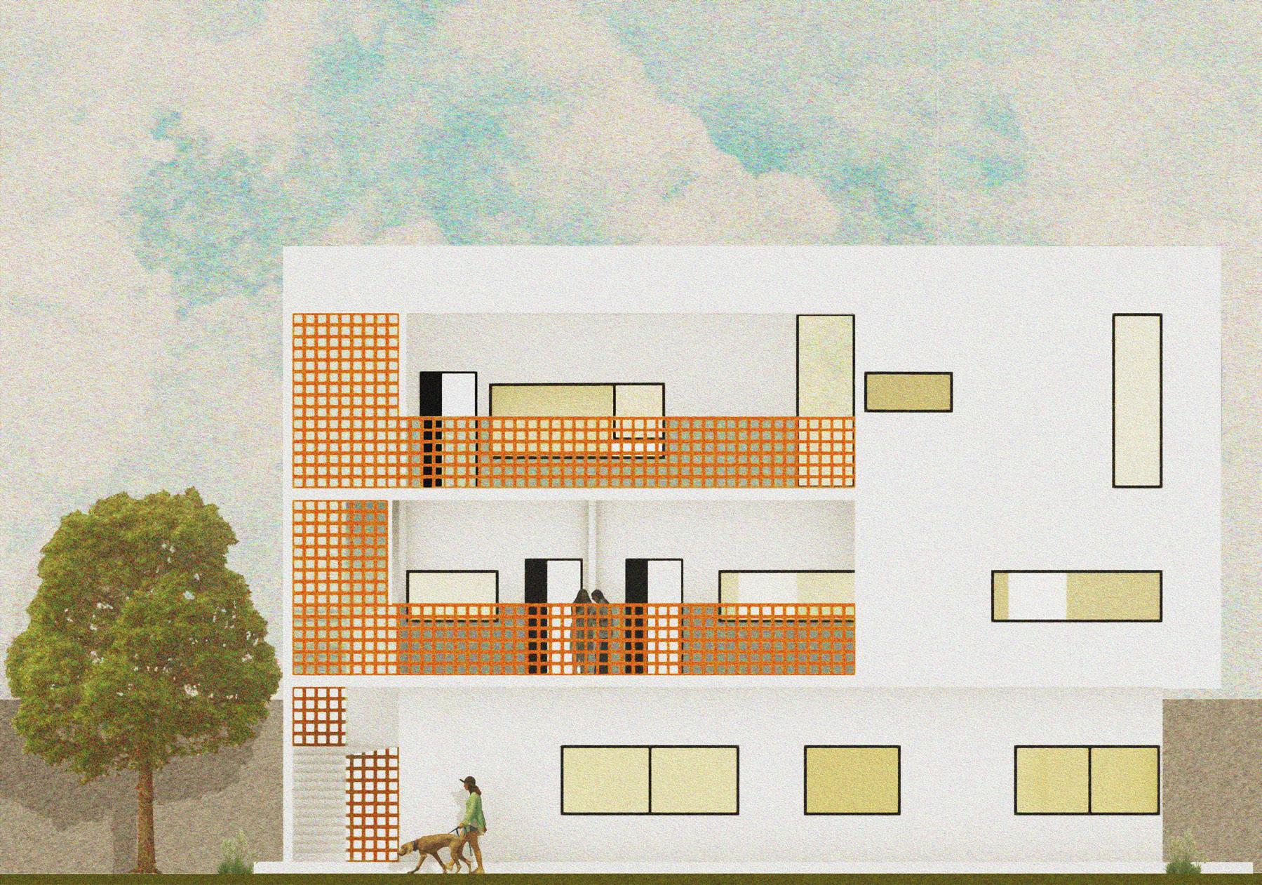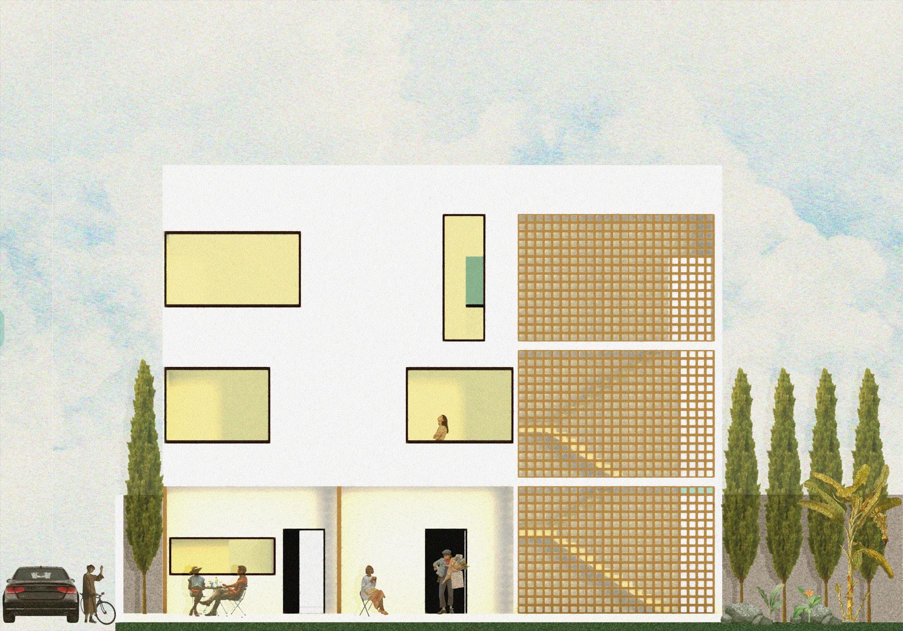PERSPECTIVE OFFRONT OF IN CONTEXT SHOWING INHABITATION