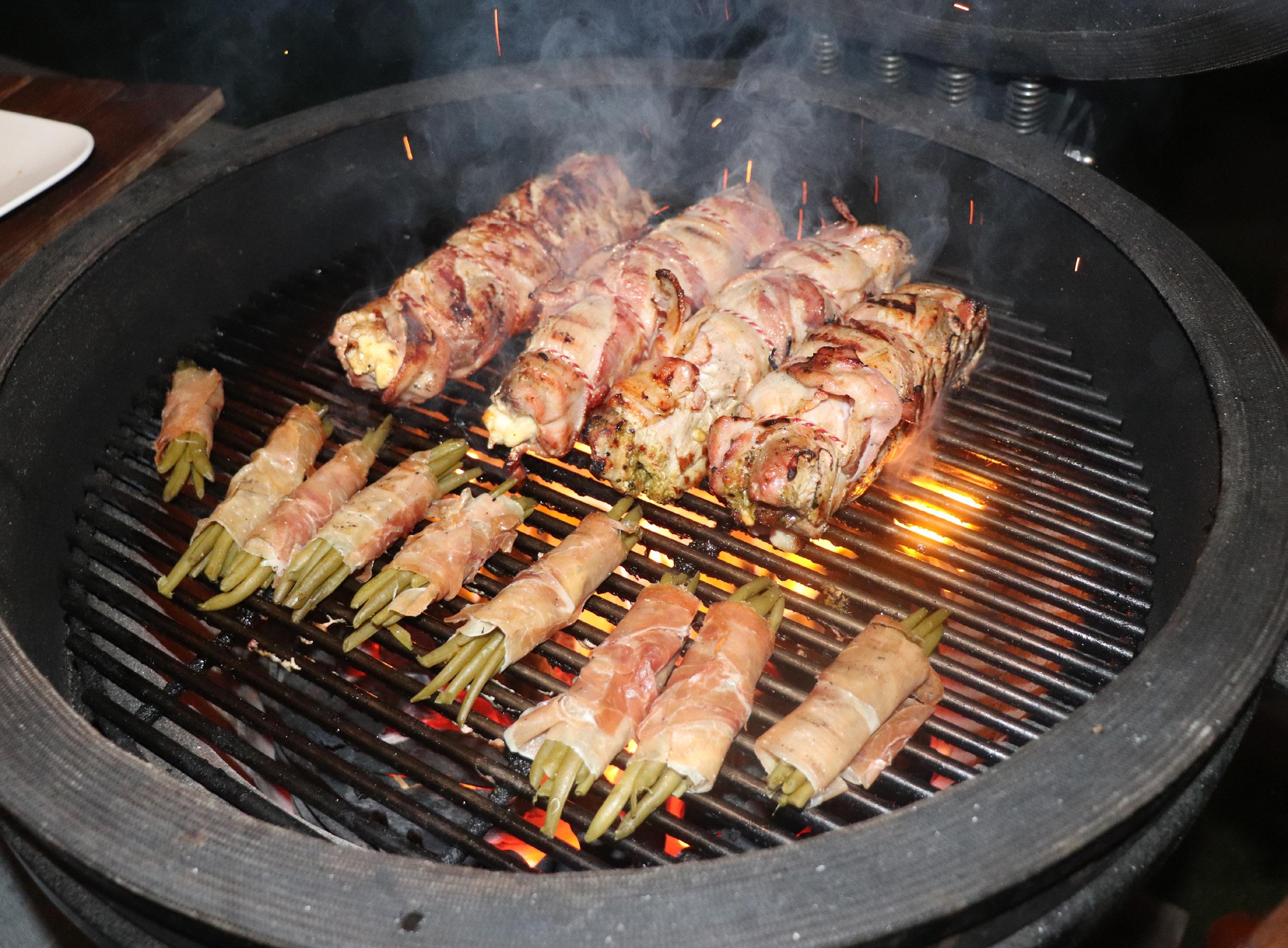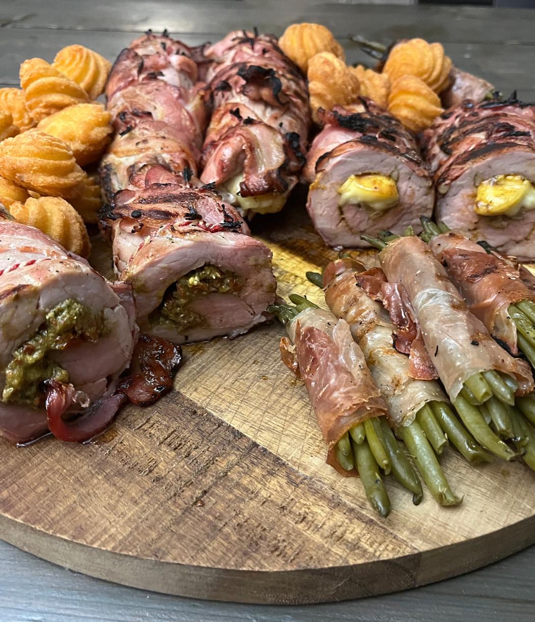 Enjoy your meal and have a wonderful Christmas! Pom Duchesse or potato croquettes Green beans wrapped in bacon, grilled on the BBQ Stewed pears