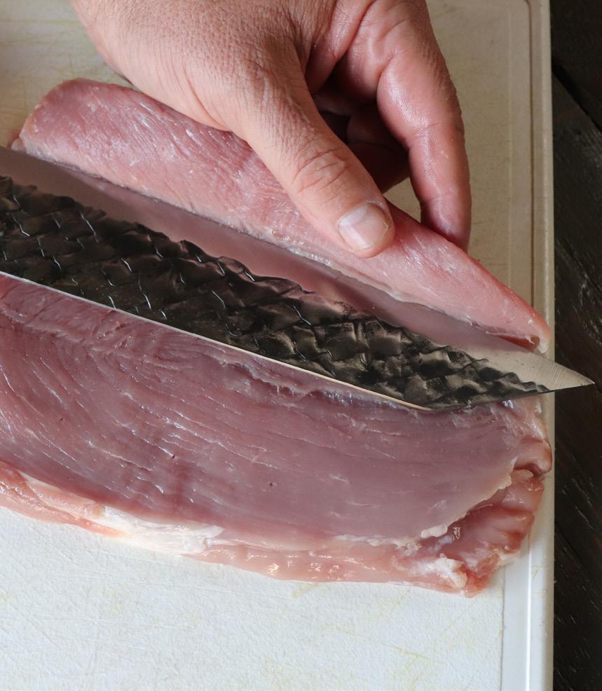 Step 1: Take a sharp knife and trim the ends and any excess fat from the pork tenderloin. Butterfly the meat by slicing it open so it can be filled later.