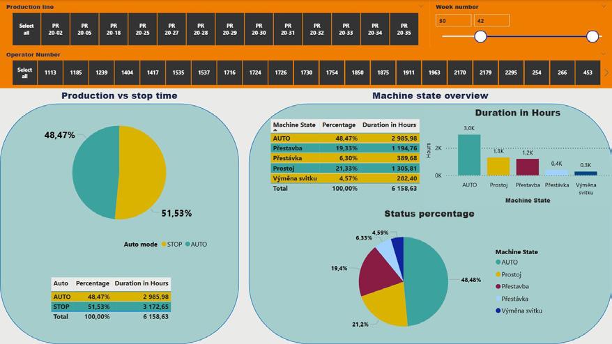 Stop-code overview: Collects reasons why our machines do not work or why they stopped Rebuilding analysis: Points to downtimes due to machine adjustments and compares suggested and actual durations.
