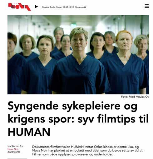 Overblikk 4 Årets festival i tall 6 Bærekraftsmål 7 Sagt om festivalen i 2023 10 Årets festivalpublikum 14 Presseklipp 18 Festivalåpning 20 Prisutdeling 24 Konkurranseprogrammene 26 HUMAN Film 46 HUMAN Live 58 Bransjeprogram 72 Teater + kunst 78 Gjester 84 Samarbeidspartnere 86 HUMAN Året rundt 55