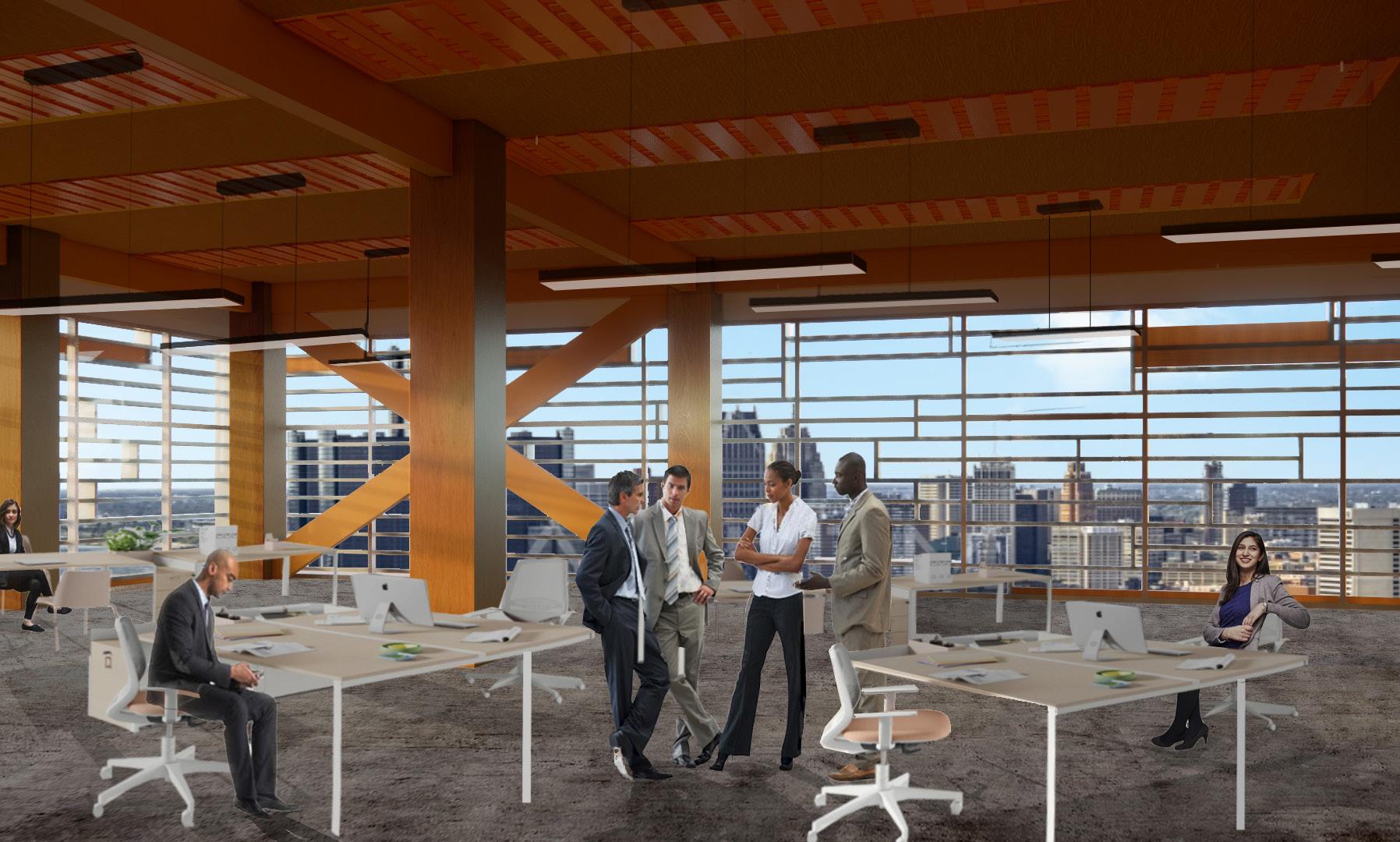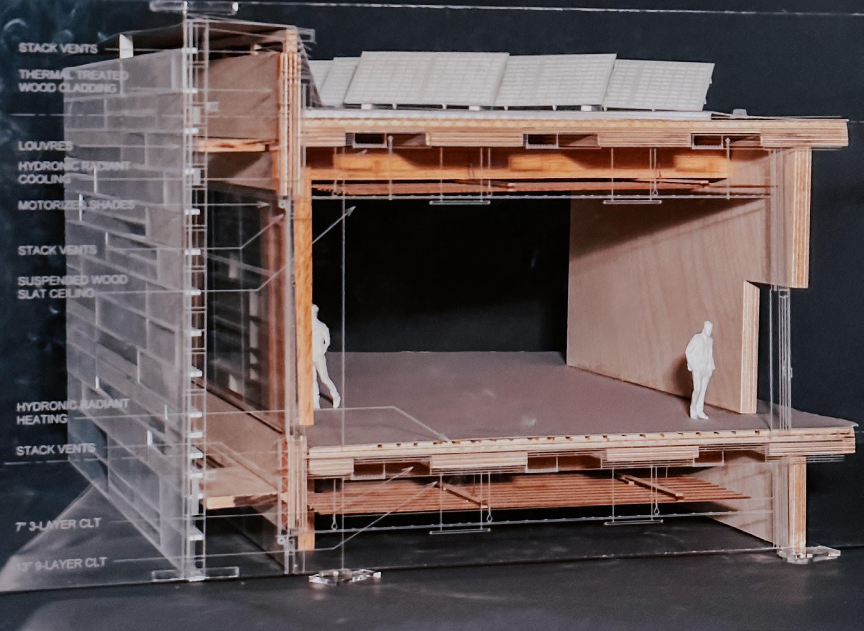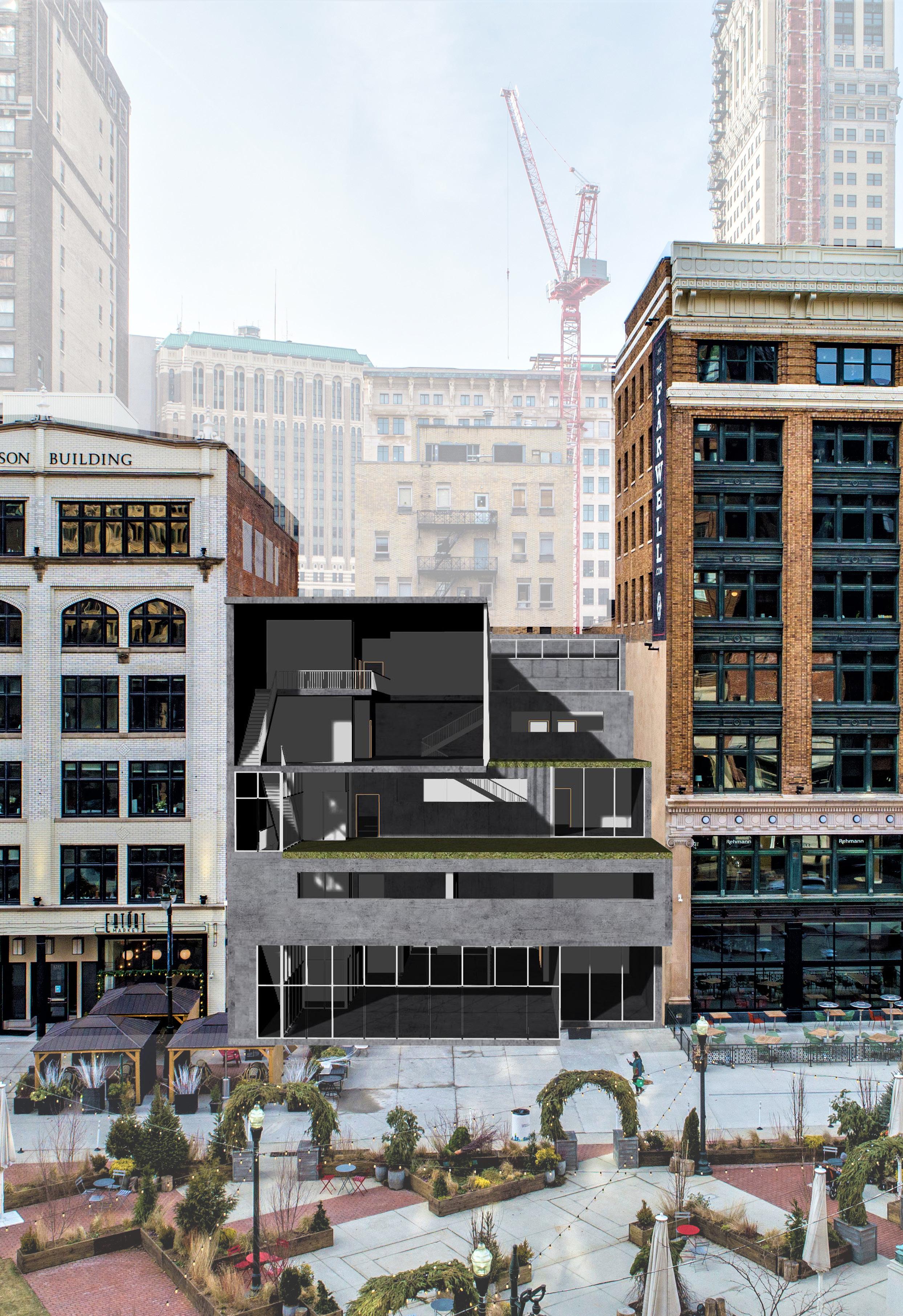 GLETA HQ is a mass timber office building, that aspires to create a sense of community through the neighboring local buildings and Riverwalk. It provides visibility to the Detroit Riverfront and connects users from the townhouses, Outdoor Adventure Center, and the harbor as a way of embracing the spirit of the Detroit Riverfront and evoking memories and emotions associated with it. GLETA also creates a sense of place for the building tenants; by providing user comfort, personal choice, and flexibility of program – by adapting to an open floor space. Through the utilization of renewable energy and a sustainable mechanical system, GLETA becomes a friend to the surrounding neighborhood of Rivertown - GLETA becomes a hub for energy production as it aims to be a below net-zero building.