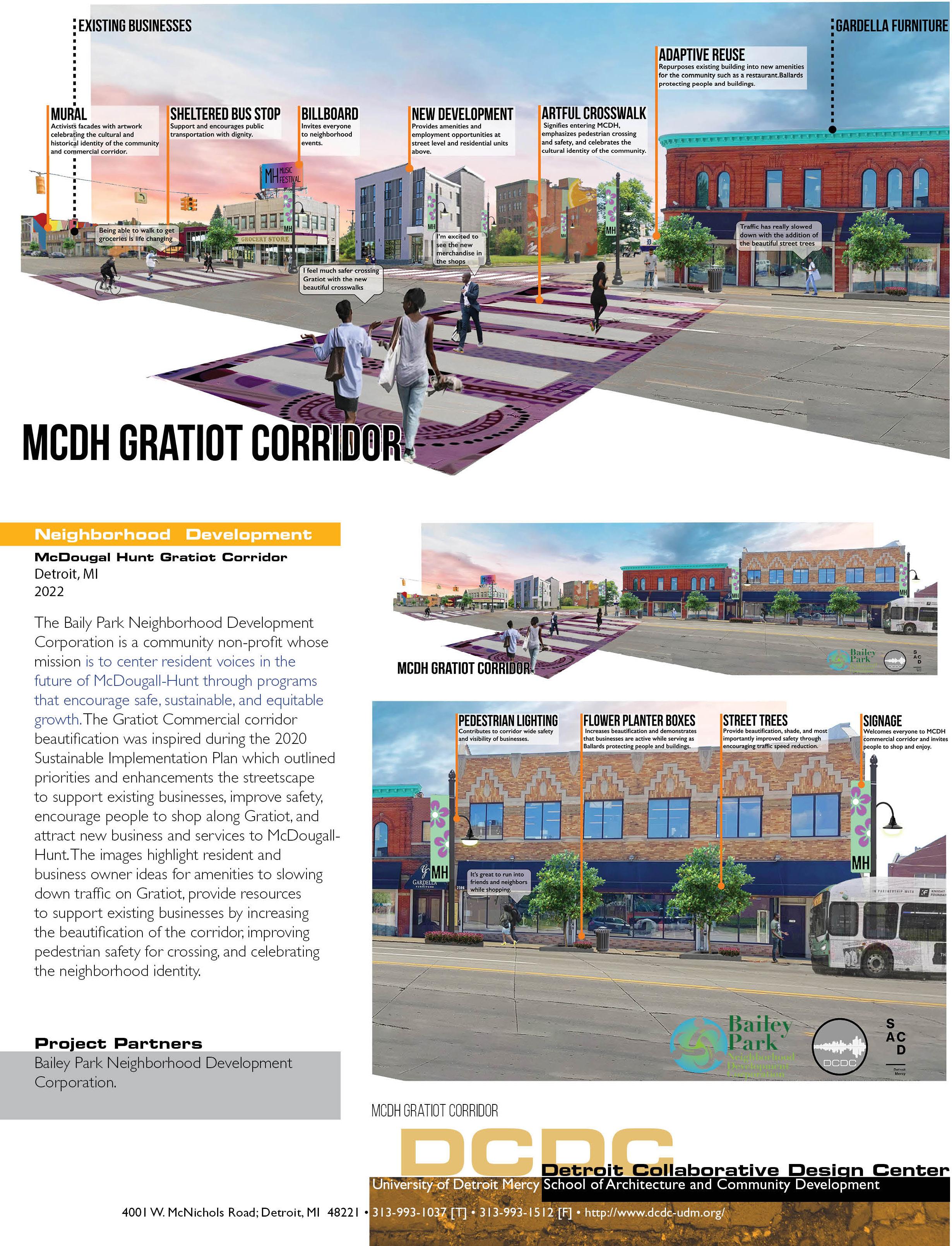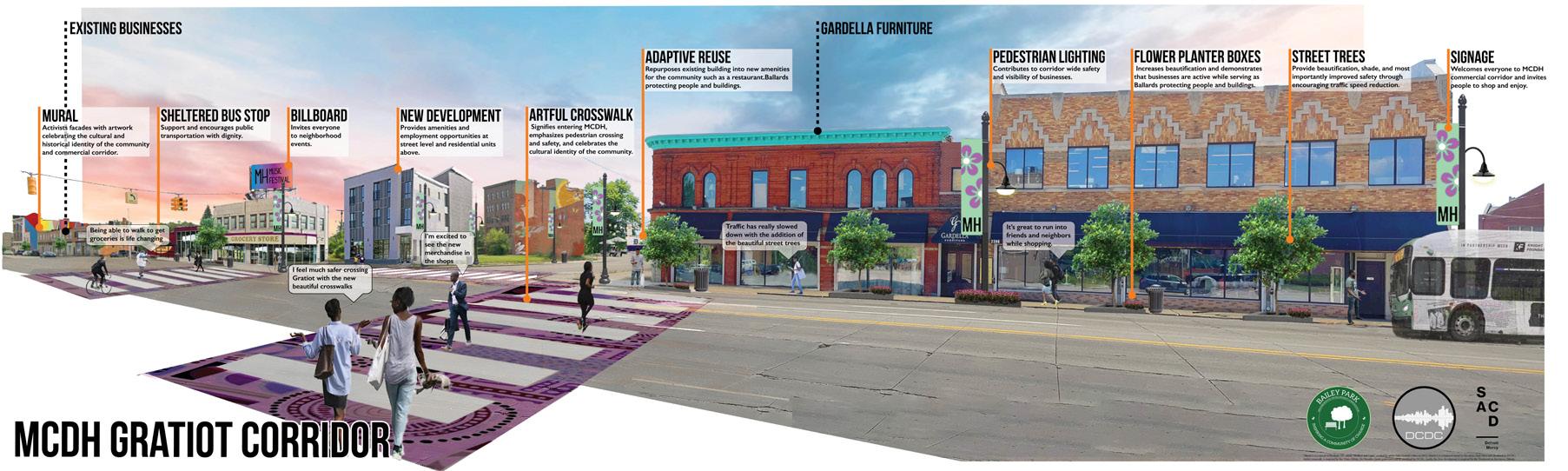 This project had the objective of addressing the concerns of business owners in the community regarding street safety, particularly along Gratiot Street, which starts at the inception of a freeway and concludes with the anticipation of high-speed traffic. Throughout the course of this project, I had the opportunity to visit the actual site and observe the initial stages of rendering, envisioning the areas with the greatest potential to capture the complete essence of the neighborhood. Furthermore, I had the privilege of attending in-person business meetings where I actively listened to their specific requirements and desires. Lastly, I incorporated the valuable feedback provided by the business owners, applying my proficient Photoshop skills to enhance the render accordingly. Through this project I also learned the importance in the community to showcase a neighborhood identity.