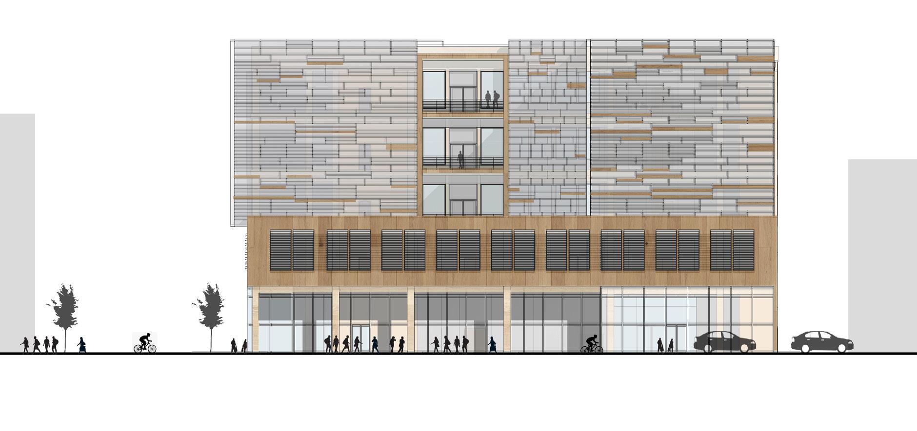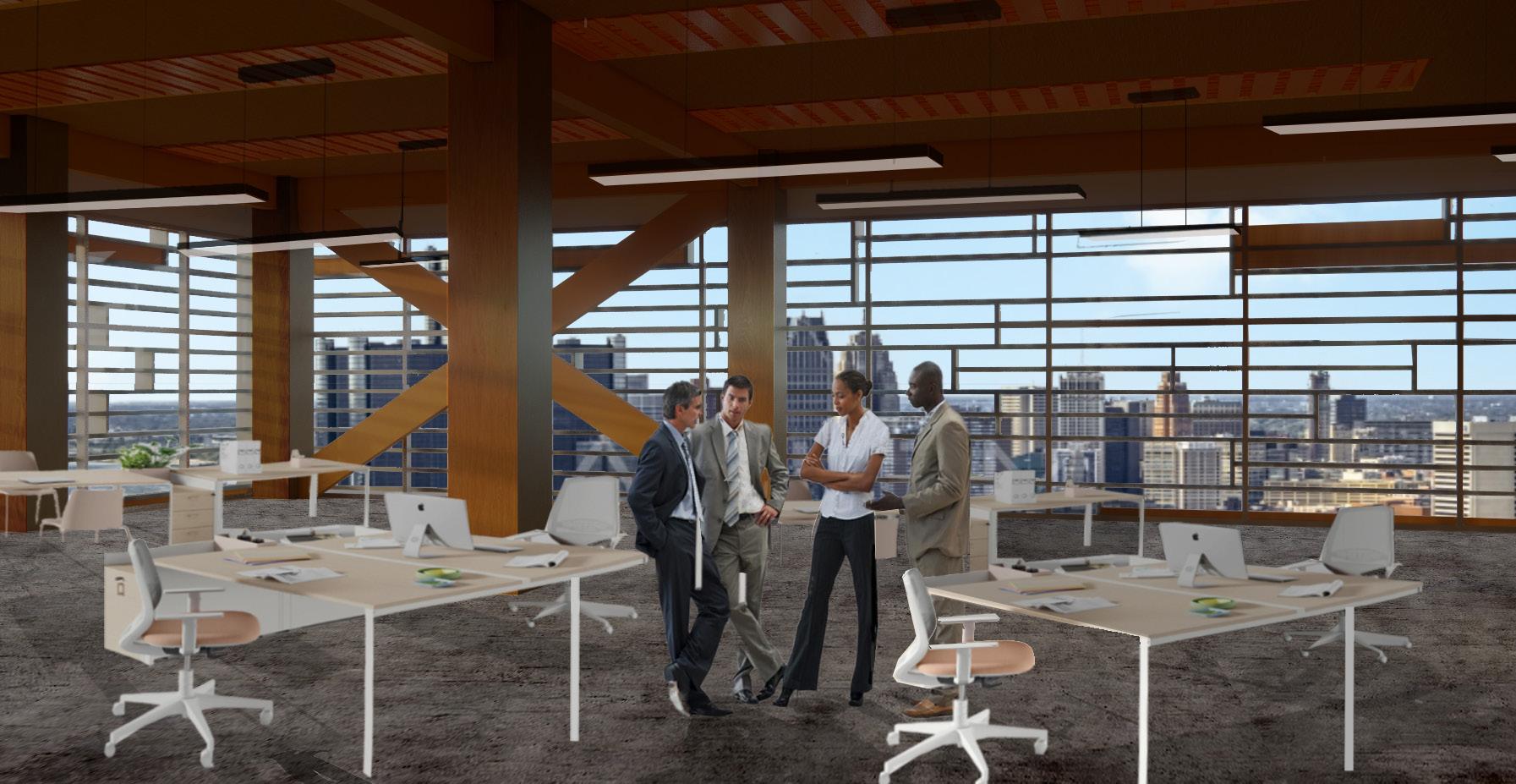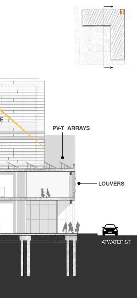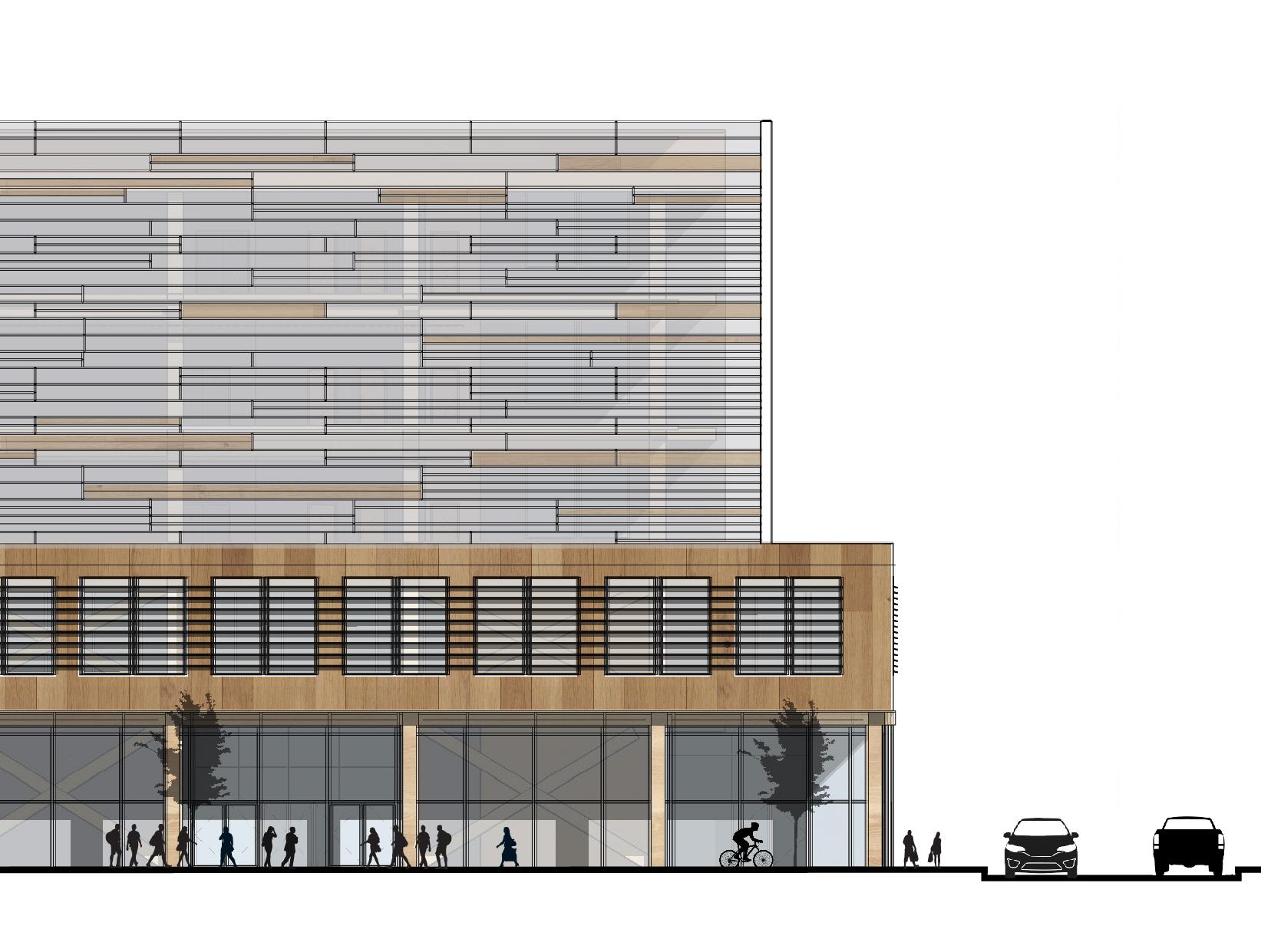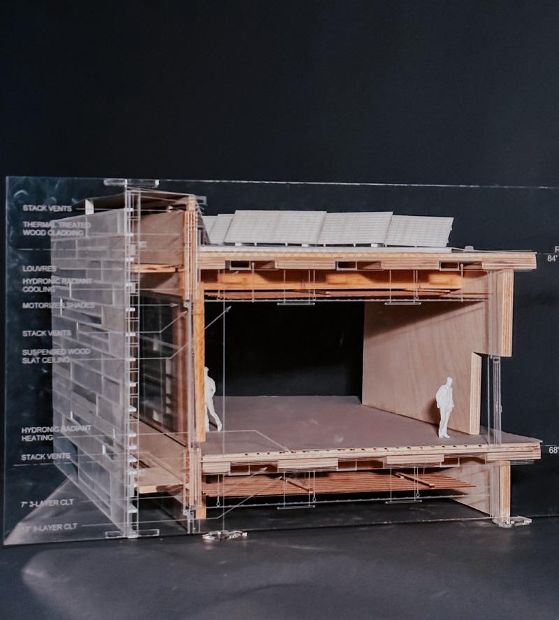 TIMBR is a mass timber office building that aims to foster a strong sense of community by integrating with the neighboring local buildings and Riverwalk. It offers captivating views of the Detroit Riverfront and seamlessly connects users from the townhouses, Outdoor Adventure Center, and the harbor, embracing the spirit of the Detroit Riverfront. TIMBR also creates a sense of belonging for the building tenants; by providing user comfort, personal choice, and flexibility of program – by adapting to an open floor space. The building employs renewable energy and a sustainable mechanical system, positioning TIMBR as a hub for energy production with its ambitious goal of achieving below net-zero emissions