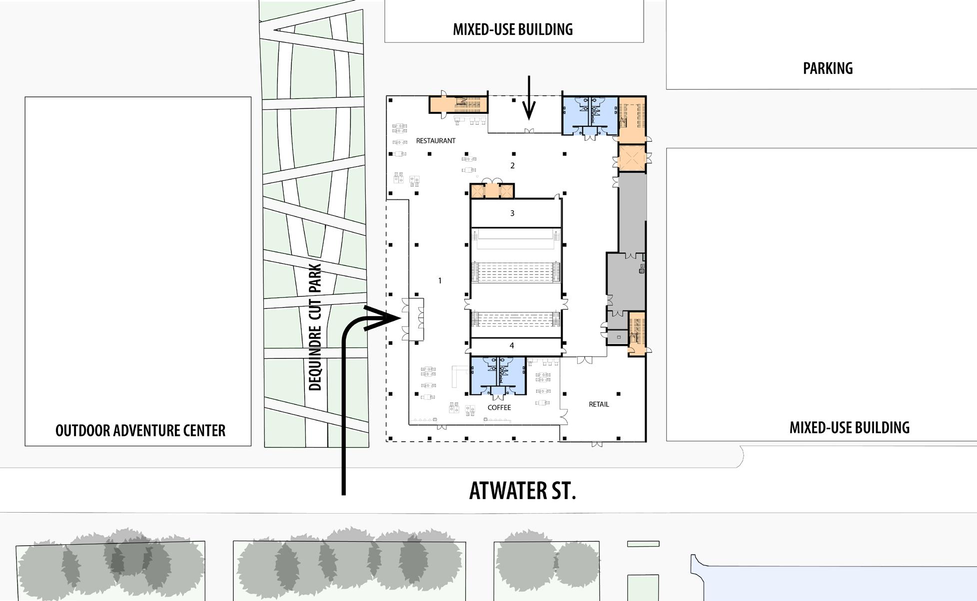 The alley is currently used as a service alley, but with our new site plan, it’s now a pathway that connects all lots. The alley design element includes water storage, seating, and color to enhance the surroundings.