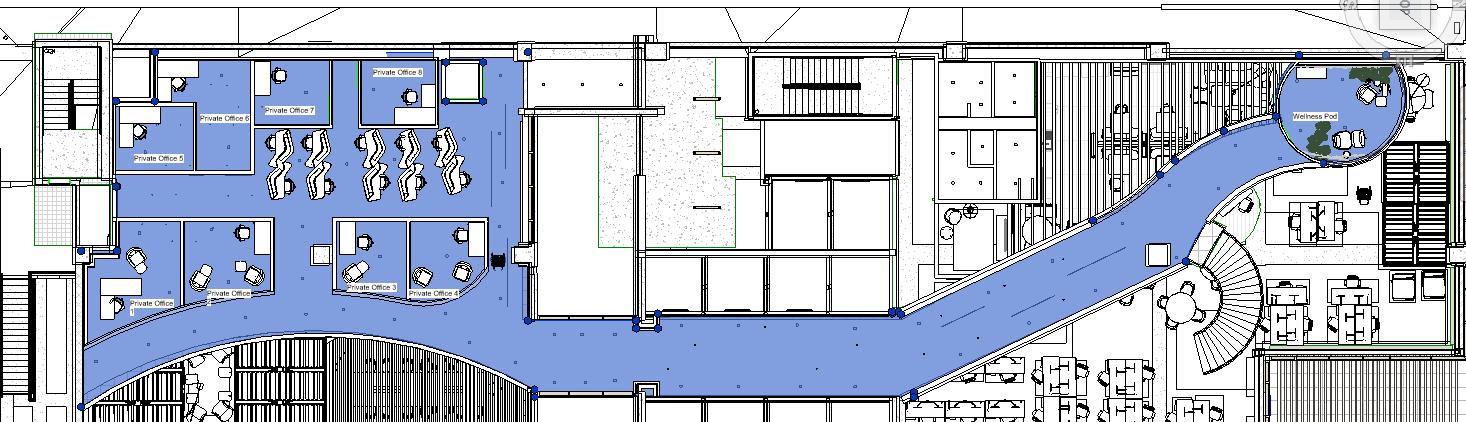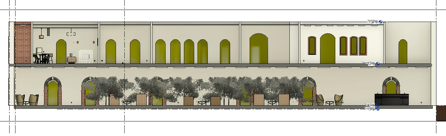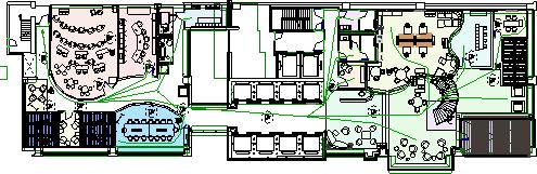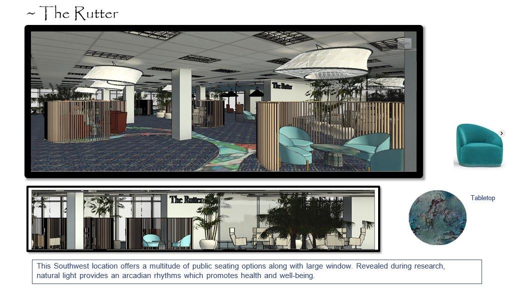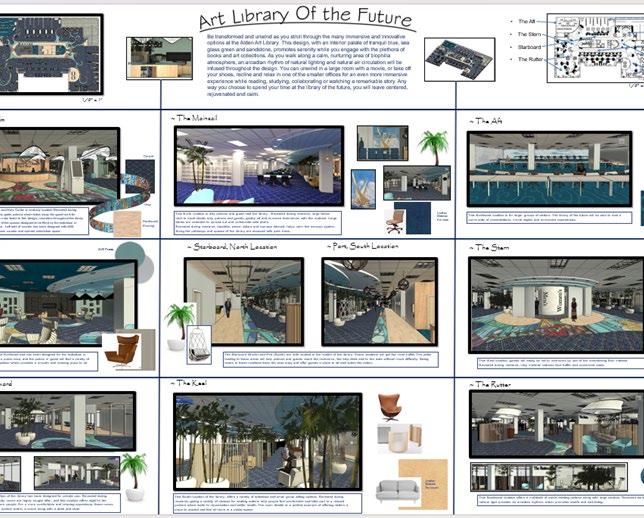 Be transformed and unwind as you stroll through the many immersive and innovative options at Alden Art Library. This design, with an interior palate of tranquil blue, sea glass green and sandstone, promotes serenity while you engage with the plethora of books and art collections. As you walk along a calm, nurturing area of a biophilia atmosphere, an arcadian rhythm of natural lighting and natural air circulation will be infused throughout the design. You can unwind in a large room with a movie or an immersive experience. Or you can take off your shoes, recline and relax in one of the smaller offices for an even more immersive experience while reading, studying, listening or watching a remarkable story. Any way you choose to spend your time at the Alden Art Library, you will leave centered, rejuvenated and calm.
