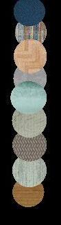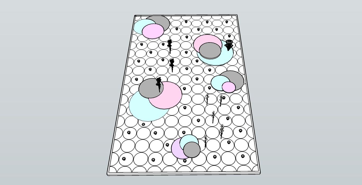 Ceiling is made up of absorbent ceiling tile and painted circles. The pink, grey and teal circles are made of wood. (colors tbd)