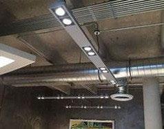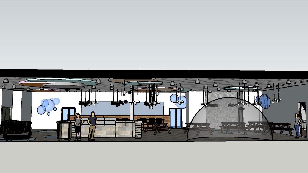 There are 40 ambient lighting, three pendent lighting over bench seating, five pendent lighting over table seating, one pendent for the carryout and merchandise counter. An additional pendant lighting will be decided for the lounge area.
