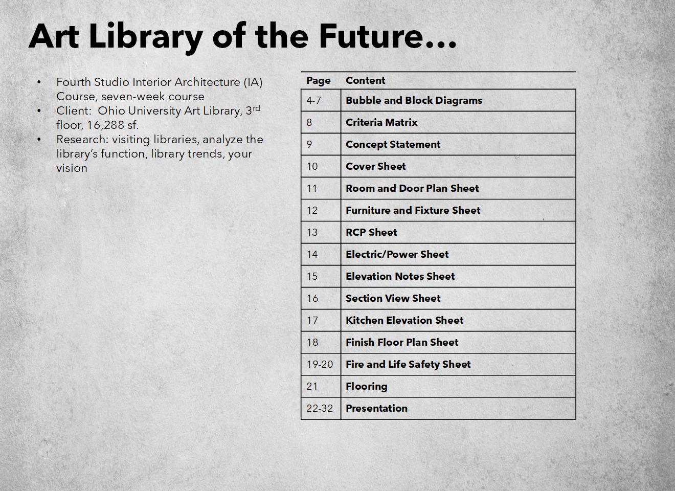In the Ohio University Interior Architecture program, I found success in both my art classes and interior architecture classes. They were challenging and I felt extreme satisfaction completing assignments and doing my best. In one perspective drawing assignment, it took six hours to complete, but it felt like fifteen minutes (see perspective drawing, page 15). When taking interior architecture classes, I was fascinated at the process of design and wanted to find out all I could at what the process looks like. I value the consistency a design process provides because it’s bigger than myself, and I can be its biggest cheerleader. Design process phases: Programming, Schematic Design, Design Development, Construction Documentation, and End of Project documentation and Critique.
