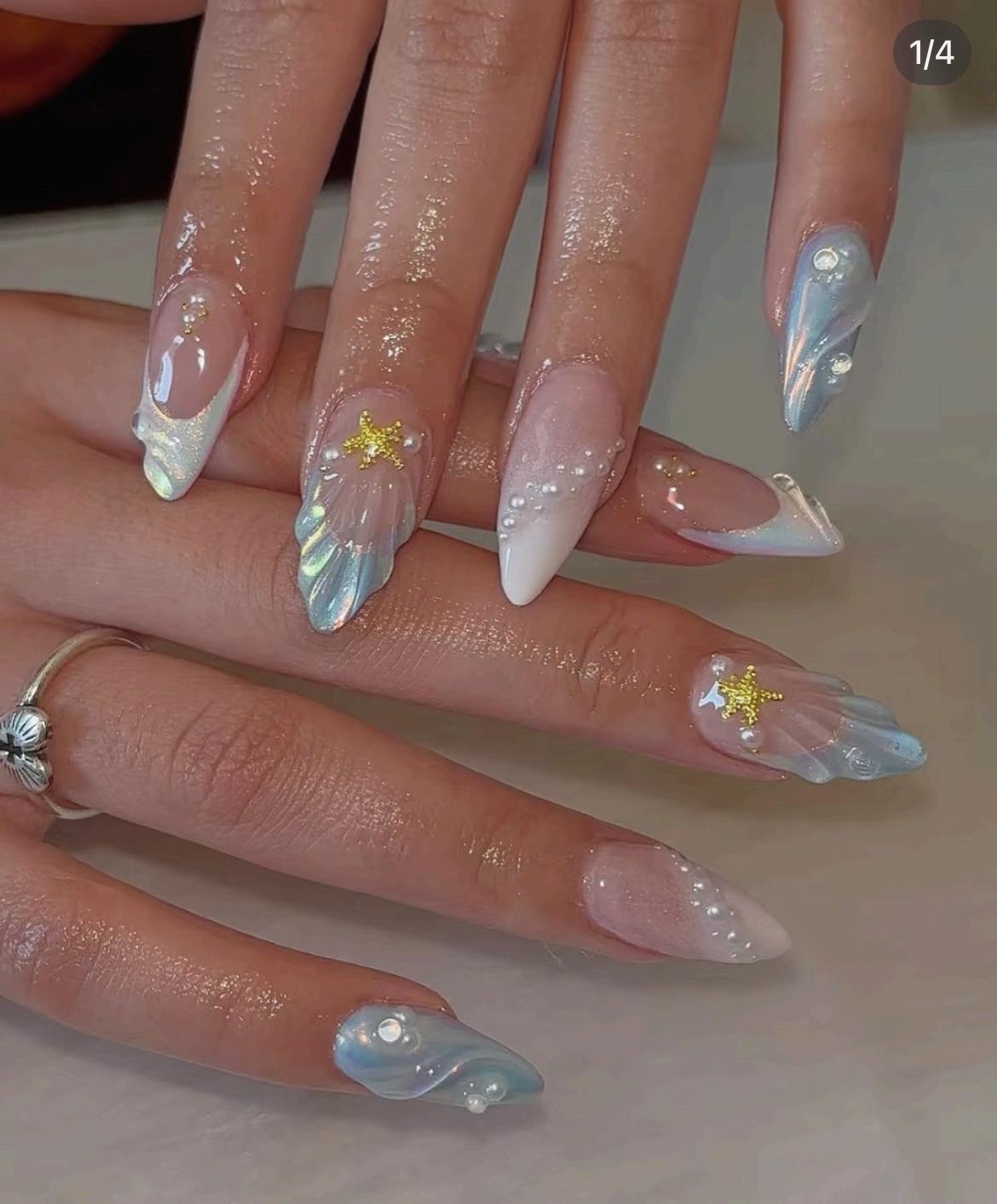 珍珠貝殼感美甲是一種融合了海洋柔光與 自然元素的優雅風格。貝殼內層的光澤與 珍珠的溫潤質地,透過珠光白、奶油粉、