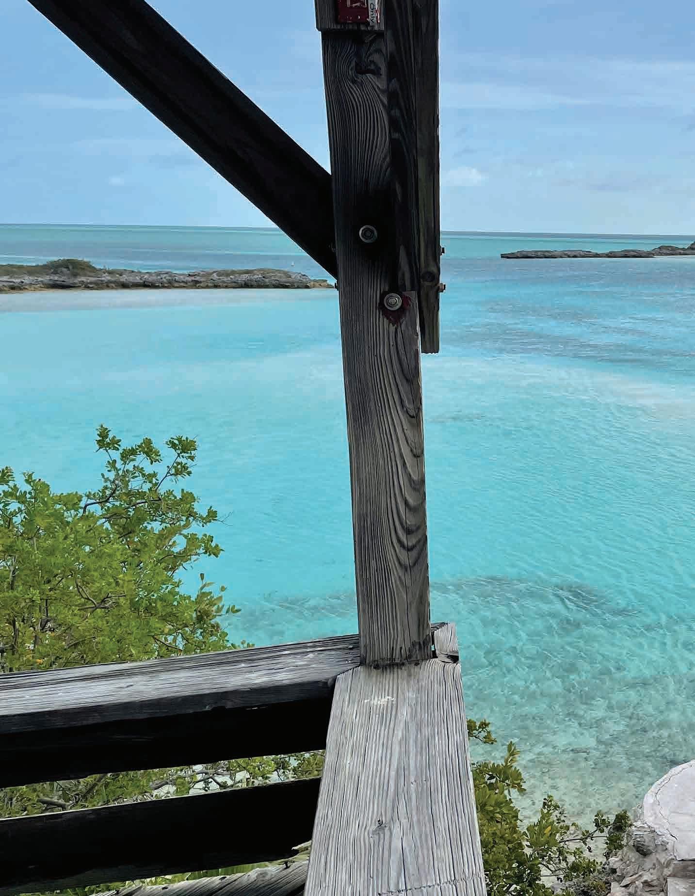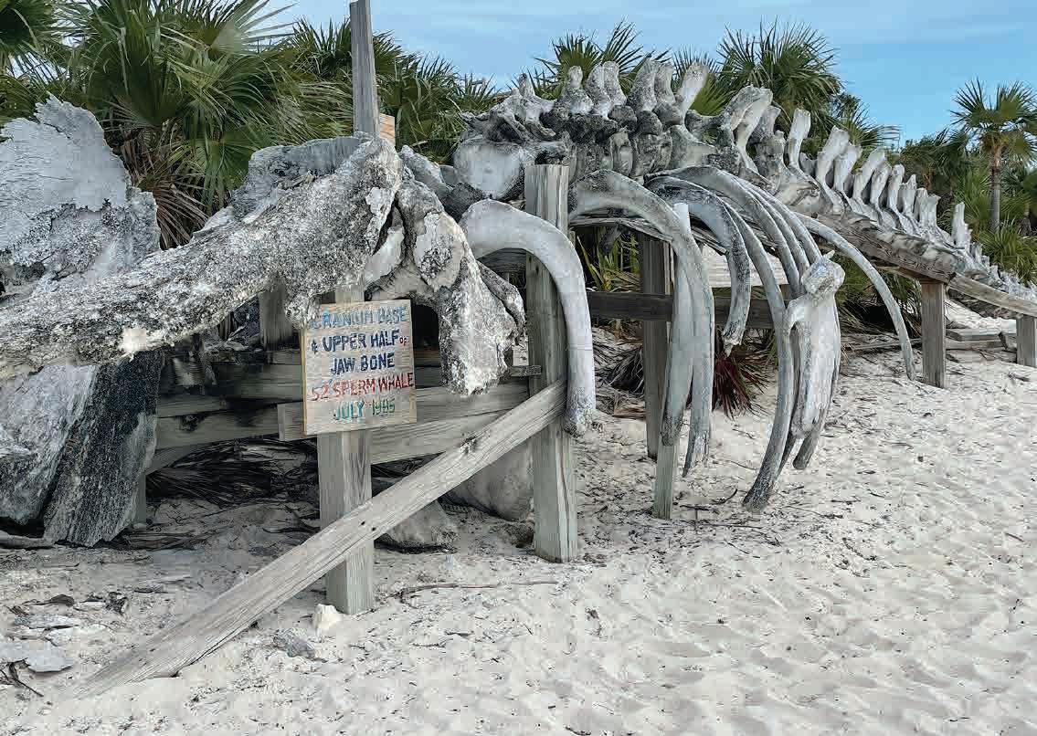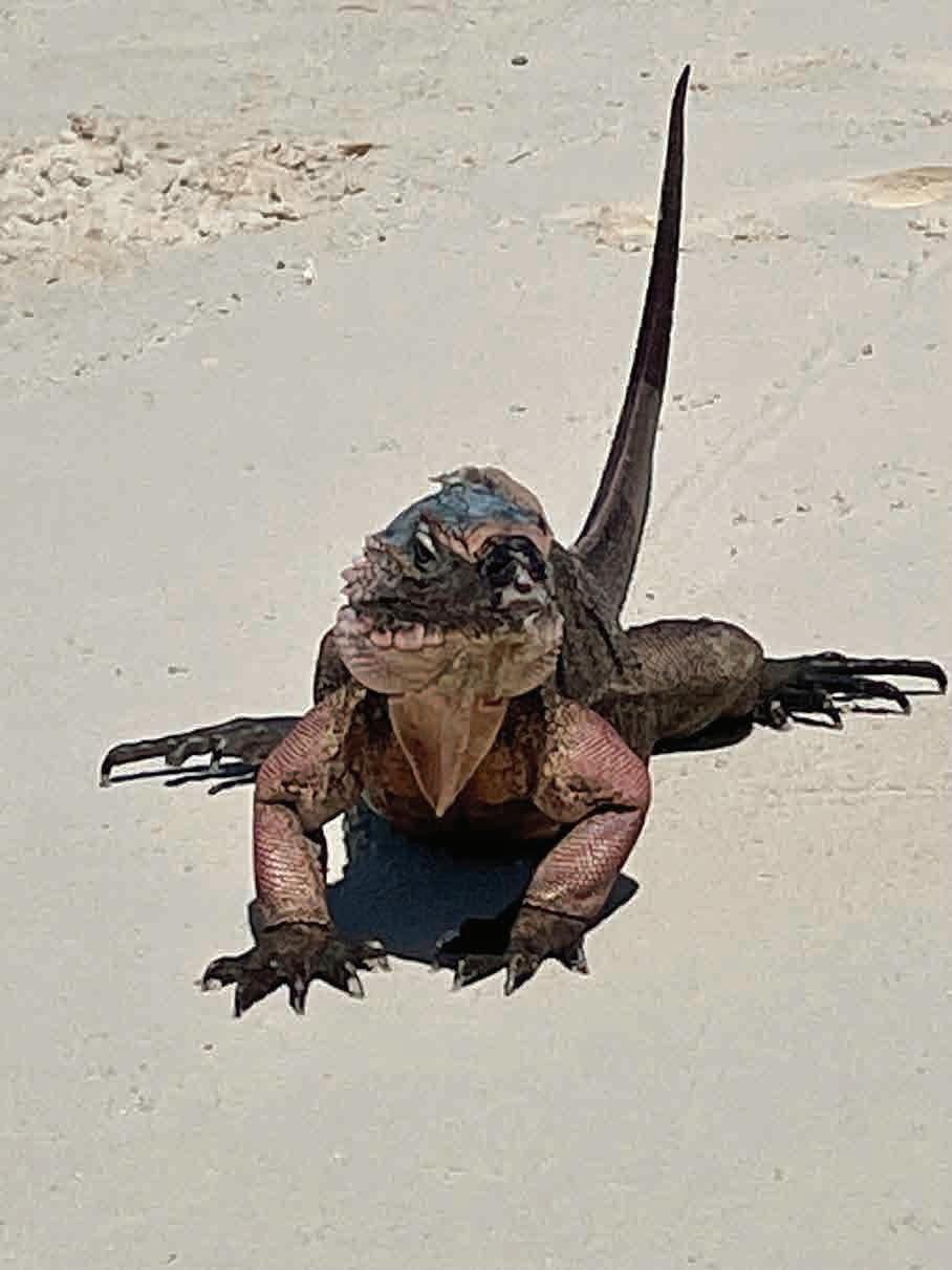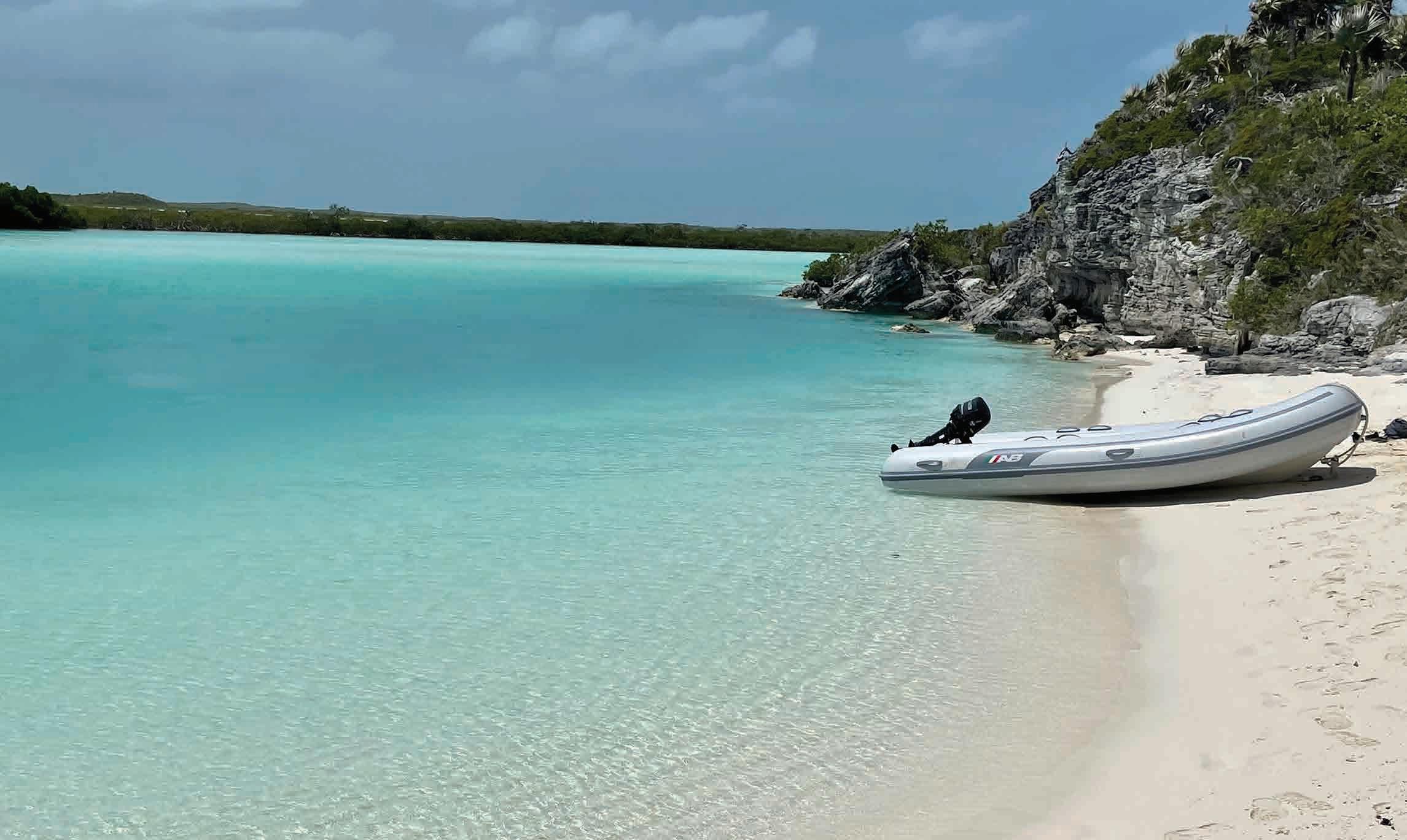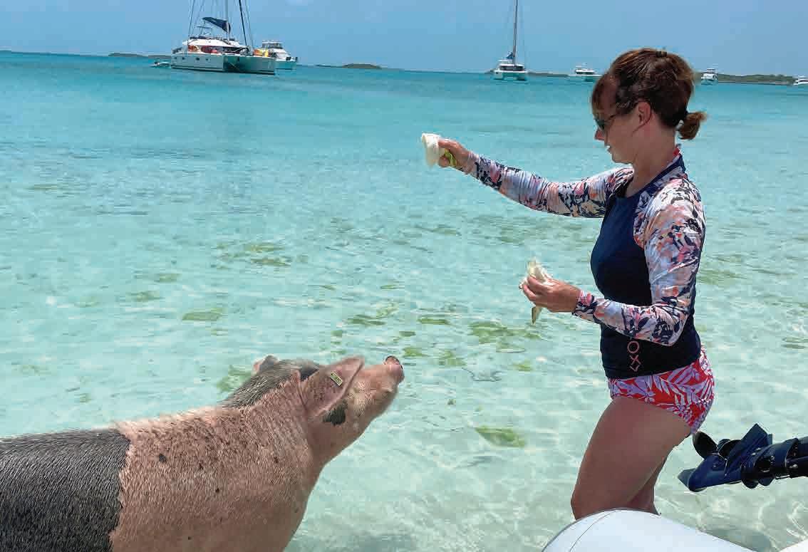 islands to pick up on the way back north. Even if we explored only the Northern and Central Exumas, we’d be covering over 170 miles round trip and no matter how you slice it, the first crossing is long and into the wind. Early afternoon on the first day brought us to Allan’s Cay and its famous iguanas that come running when they see a dinghy pull up on the beach. They love fruit but so do the seagulls which are nasty little bandits that will attack you, your goodies and the iguanas. Feeder beware. We had some fun with the lizards and with plenty of daylight left, we set course for Shroud Cay at the top of the Exuma Cays Land and Sea Park, a 176-square-mile preserve with 15 major isles. Shroud has tidal creeks, one of which allows motorized traffic. A meandering dinghy trip through the mangroves with turtles all around brought us to Driftwood Beach that looks like a Hollywood set of a desert island. We pulled the dinghy up on the beach and then waded back into the water to catch a wonderful drift ride toward the Exumas Sound (east side of the chain). A sandbar stops you from being washed out to sea so you just walk back up the beach and do it again, and again – like a ride at Disneyland. The colors of the water as they swirl between the sandbars give your camera a workout but no matter how hard you try, it’s impossible to capture what can be seen by the naked eye. Warderick Wells was the next stop with a walk to Boo Boo Beach, a pile of driftwood inscribed with boat names. It’s a sort of cruisers’ shrine that keeps a silent record of all who pass, until the next hurricane blows it clean off the island. Having paid for a mooring ($100), we opted to stay the night. The next morning, we headed down to Big Major on Fowl Cay for the world-famous swimming pigs. There are about 50 of them, all jostling for whatever food arrives via dinghy. Some are big and demanding, some are tiny and shy, but all enjoy a treat. Just around the corner is Thunderball Grotto, a cave desagradable. Con un itinerario corto, el desafío con las Exumas es qué cubrir en el camino hacia abajo y qué islas recorrer en el camino de regreso al norte. Incluso si exploramos solo las Exumas del norte y el centro, cubriremos más de 170 millas de ida y vuelta y, sin importar cómo se mire, la primera travesía es larga y contra el viento. La tarde del primer día nos llevó al Cayo Allan y sus famosas iguanas que vienen corriendo cuando ven que un bote se detiene en la playa. Les encanta la fruta, pero también le gusta a las gaviotas, pequeñas bandidas que te atacarán a ti, a tus golosinas y a las iguanas. No se recomienda alimentarlas. Nos divertimos un poco con las lagartijas y, con mucha luz del día, pusimos rumbo a Shroud Cay en la cima del Exuma Cays Land and Sea Park, una reserva de 176 millas cuadradas con quince cayos principales. Shroud tiene arroyos de marea, uno de los cuales permite el tráfico motorizado. Un viaje serpenteante en bote a través de los manglares con tortugas por todas partes nos llevó a Driftwood Beach que parece un estudio de Hollywood de una isla desierta. Detuvimos el bote en la playa y luego regresamos al agua para dejarnos flotar a la deriva hacia Exumas Sound (al lado este de la cadena). Este es un banco de arena que sirve de protección para evitar ser arrastrados al mar, así que caminamos de regreso a la playa y volvimos a dejarnos flotar a la deriva una y otra vez, como en un maravilloso paseo en Disneyland. Los colores del agua mientras se arremolinan entre los bancos de arena te tentarán a tomar varias fotografías, pero no importa cuánto te esfuerces, es imposible capturar lo que se puede ver a simple vista. Warderick Wells fue la siguiente parada con un paseo hasta la playa de Boo Boo, un montón de madera flotante inscrita con nombres de barcos. Es una especie de santuario de cruceros que guarda un registro silencioso de todos los que pasan, hasta que el próximo huracán lo borra de la isla. Habiendo pagado el amarre ($ 100), optamos por pasar aquí la noche.