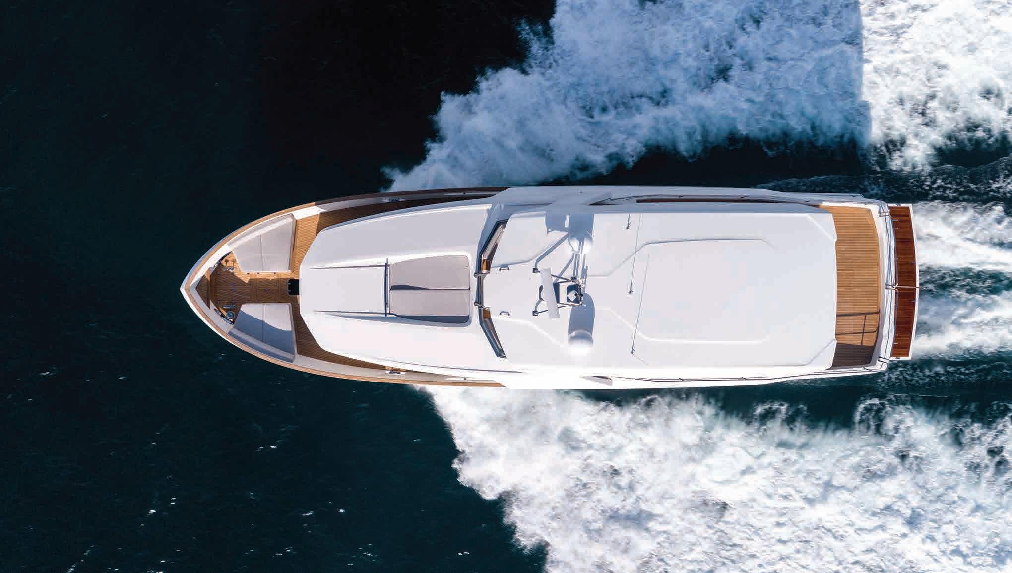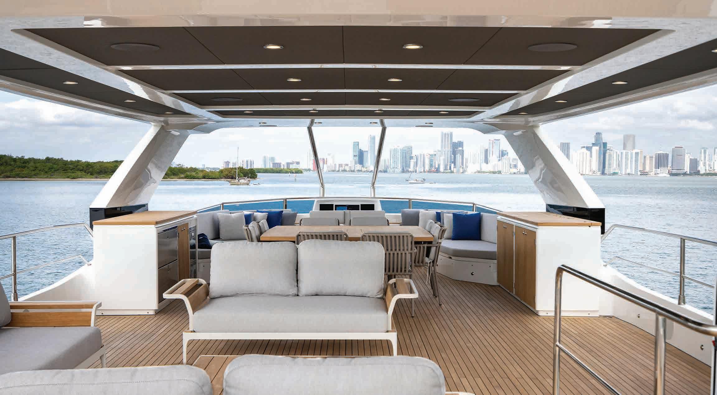 Una característica destacada de este barco es el flybridge especial de 65 m2 (700 pies cuadrados), el más grande en su categoría y con espacio para una embarcación auxiliar de 3 m (9,8 pies) (alternativamente, el espacio se puede usar para almacenar 2 motos de agua y se puede guardar una embarcación auxiliar de 4,5 m (13 pies) en la plataforma de baño). Además del segundo puesto de mando, hay un comedor a la sombra con bar y tumbonas en la cubierta abierta de popa. Los clientes pueden elegir entre un techo rígido extendido o un techo blando para el flybridge.
