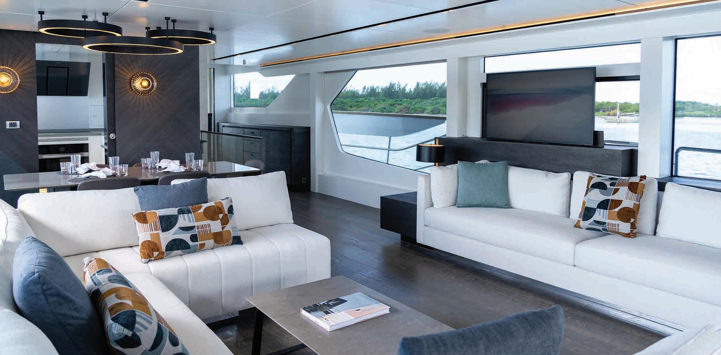 The 48 sqm (517 sq ft) main saloon and dining room is light and airy thanks to full-height windows and the galley is conveniently placed adjacent to the dining space. A section of the saloon windows slides open to create a floating balcony over the sea. Including the sofa seating in the bow, the yacht boasts a total of 138 sqm (1485 sq ft) of exterior deck space.
