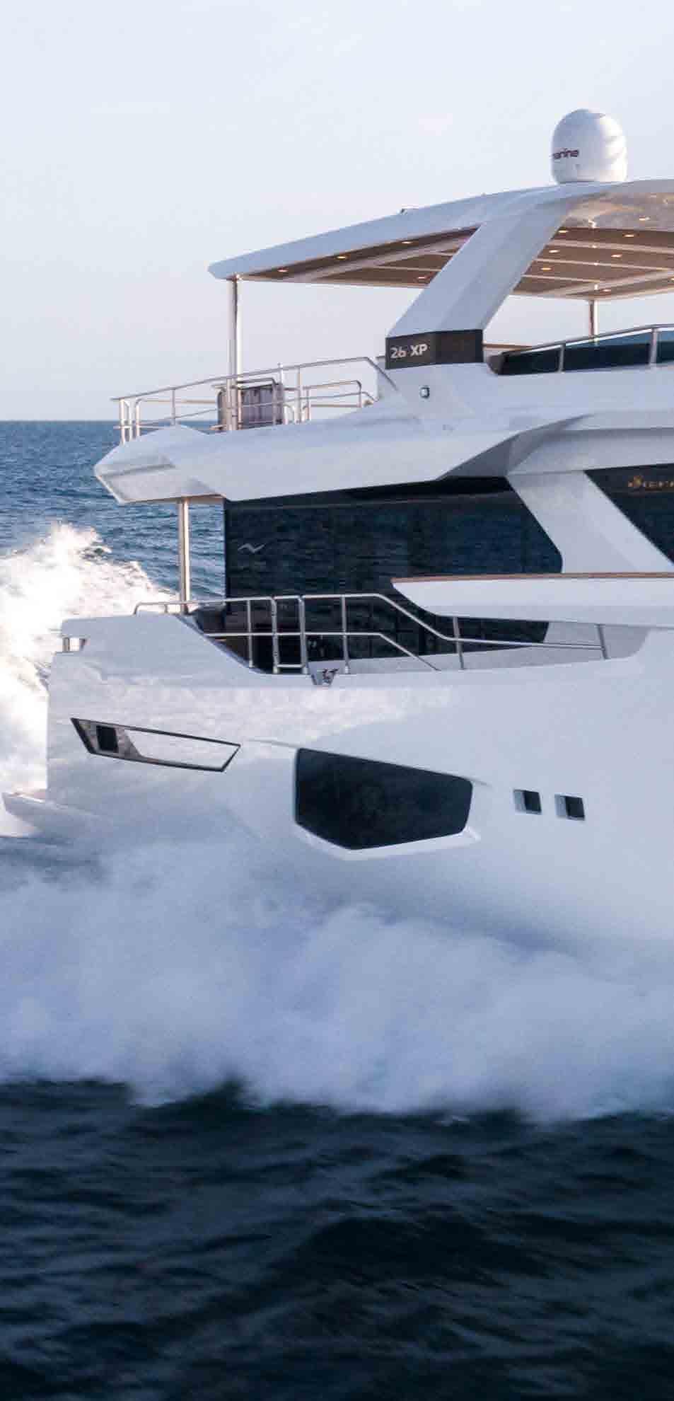 Although the 26XP Fast has the same angular windows and vertical bow as her larger sisters, she is designed to offer the same comfort and amenities in a more compact package. In addition, the 26XP Fast’s modest draft makes her ideal for cruising the shallow waters of the Bahamas. A standout feature of the 26XP Fast is the special 65sqm (700 sq ft) flybridge, the biggest in its size category with space for a 3m (9.8ft) tender (alternatively, the space can be used for storing 2 jet Skis and a 4.5m (13ft) tender can be stowed on the swim platform). In addition to the second helm station, there is a shaded dining area with bar and sun loungers on the open aft deck. Clients can choose between an extended hardtop or a soft top for the flybridge.
