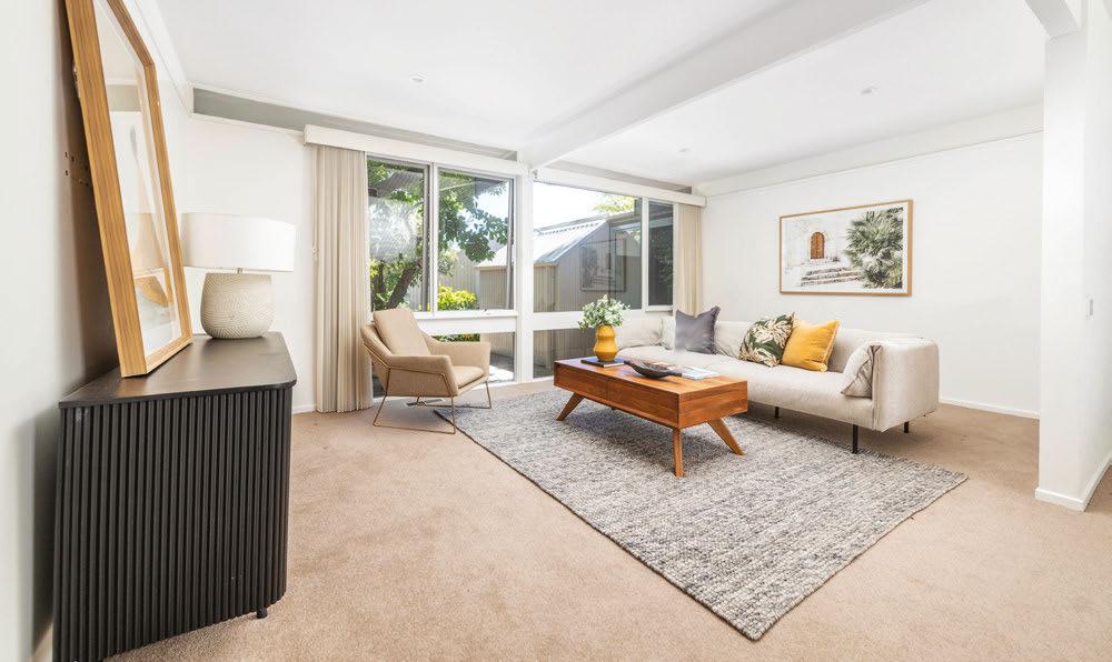 “This timeless, sunkissed Pettit & Sevitt design has been tastefully renovated, is sited on an impressive 2146-square-metre block and is the ideal retreat for … those wanting space and seclusion.” contemporary fxtures, while the bedrooms – fve in total – enjoy garden views and generous storage.